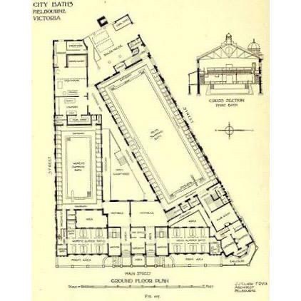 #MelbourneCityBaths, 1902-4, design by #JJClark with his son #EJClarke. Delightful #redbrick stripy Edwardian (“#bloodandbandages”), with #EnglishBaroque details, and Clark’s favoured Tudory #turrets and #domes. JJ’s first design was the old treasury building 42 years previously when he was just 19. Great plan, filling the triangular site. Note the rooms at the front with actual baths in them; this wasn’t built only for swimming, but to provide facilities for people to have a comfortable hot bath in a period when people (especially in nearby low rent Carlton and the even lower rent ‘slums’ of little Lon) didn’t have bathrooms. It was nearly lost in the 70s, but the fight was on, and the BLF put a black ban on it c1972 (apparently) and it was restored instead in 1981-83, adding a gym and squash courts etc just in time for the #aerobics craze. Restoration was by Kevin Greenhatch and Gunn Williams Fender, and won an Institute award for ‘Recycling a Public Building’ in 1984 (restoration awards only started in 1982). They kept a few of the baths for historical reasons, now they’re part of a #dayspa, of course. The stairs were rebuilt differently, originally further apart to provide separate entrances for men and women (who got the smaller pool). Bath photo from their website. Photo of men’s pool by #RennieEllis from the 80s.