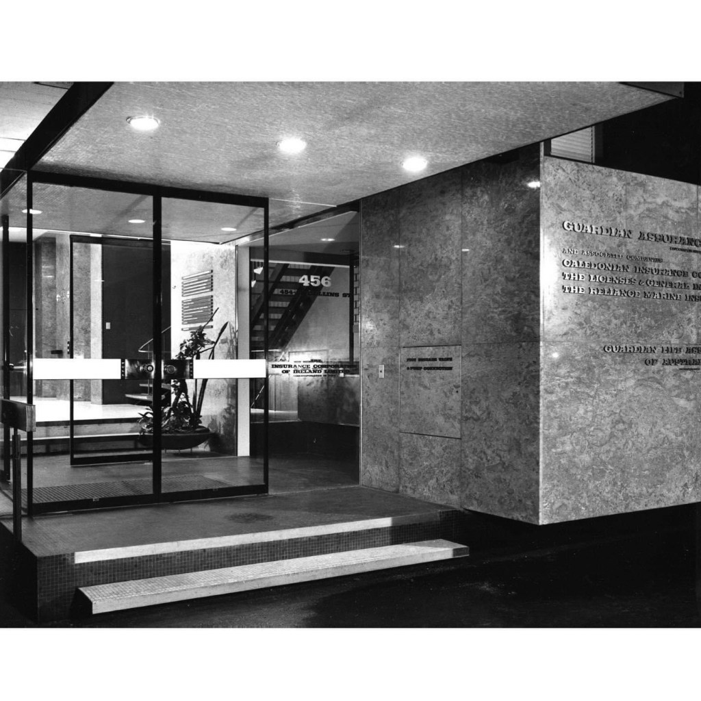 Always had a soft spot for his one – #GuardianInsurance, corner of Collins & William, 1960-61 – it’s clad in precast concrete panels faced with Stawell stone, and its representative of the sudden move in 1960 to a sense of solidity in office buildings, away from the 50s glass curtain walls – which had been led by #BatesSmartMcCutcheon – but they also led the change, like this one, done in stone perhaps reflecting its location amongst older stone facades in the traditional financial end of Collins Street. A simple grid, but nice that it’s stone, with some delicate detailing too. Streetview images, plus great shots from 1961 by #WolfgandSievers from @library_vic, one showing the long gone snazzy foyer. This is one of the 55 #midcenturymodern #officetowers proposed for listing as part of the #hoddlegridheritagereview. Update : now heritage listed.
