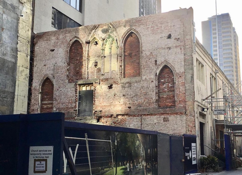 Pleased to report (belatedly) that the proposal to create a cafe by inserting a mezzanine and infilling the stage area of the 1938 Nicholas Hall next to the Wesley Church on Lonsdale Street was refused by Heritage Victoria in August last year – they did not agree that that the requirement for ‘328 covers’ was sufficient justification for the alterations. Not so pleased to report the developers have now asked for a review by the Heritage Council – I hope they’ll uphold the decision, an example of how Heritage Victoria recently has become more strict (as strict perhaps as they should have been all along!). The hall is a delightful example of Art Deco, designed by #HarryNorris, and yet another gift from the Nicholas family to the Wesley church, which sits behind the recently revealed ‘ghost wall’ of the 1888 Conference Hall, demolished in the 1970s. I don’t know where I got the first image, the others are from the submission to HV, the ghost wall is mine.