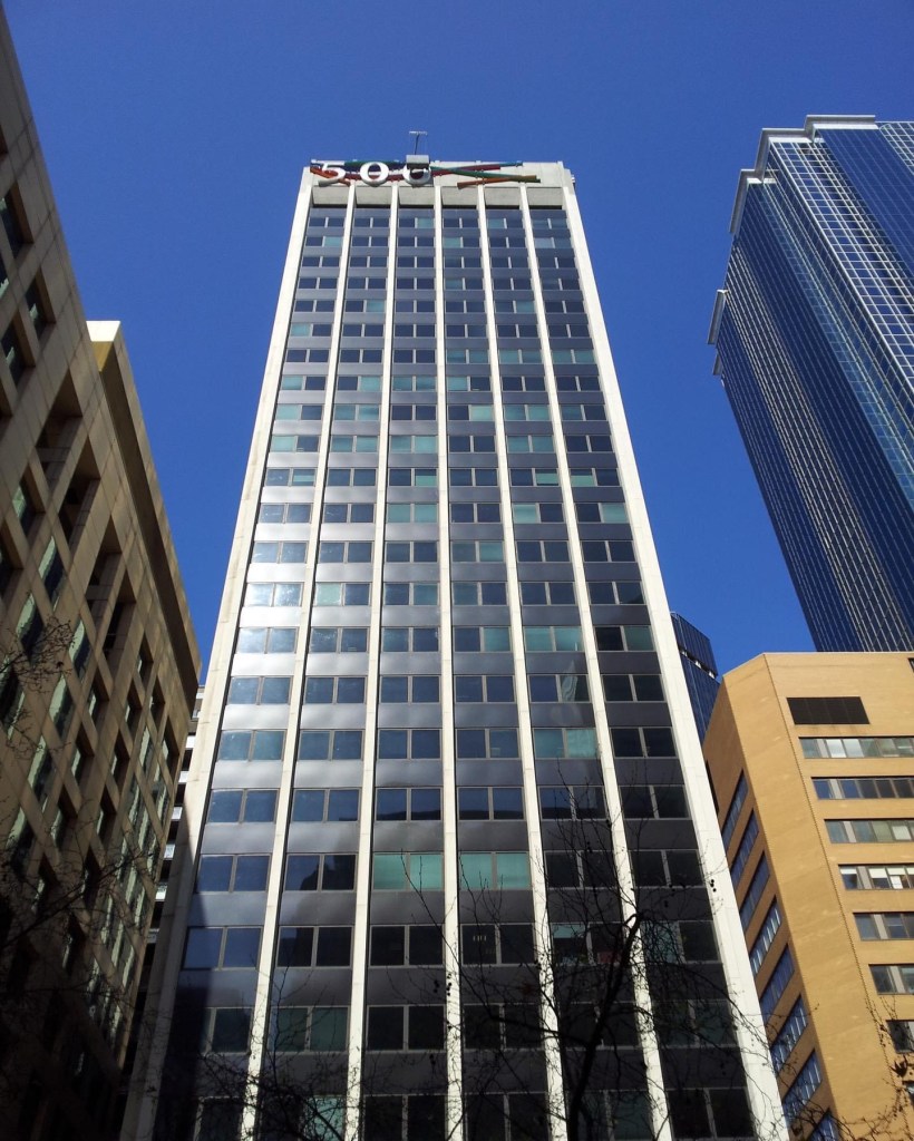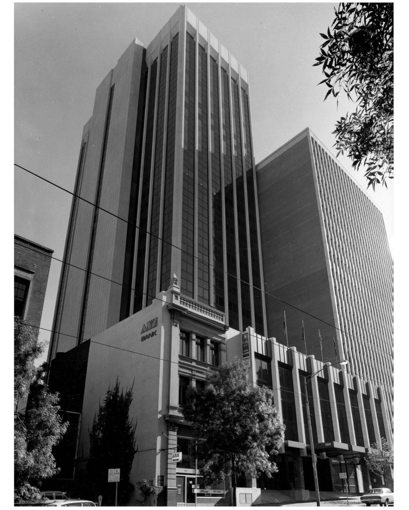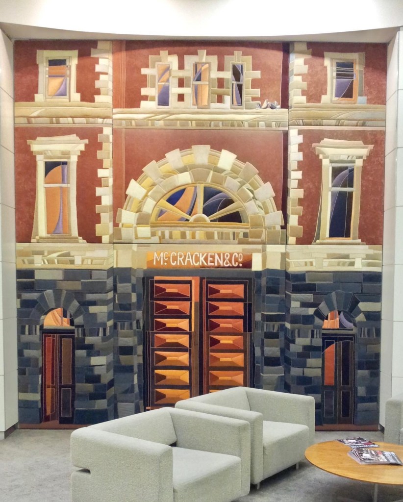 Facade as soft furnishing – a curious quilted artwork depicting #McCrackensBrewery – which once stood in #CollinsStreet, and the last part was demolished c1969 for #500CollinsStreet – where this is installed in the foyer – behind a column ! (My memory is it was once straight ahead). Someone once told me this tower was originally prestigious, but I can’t even find the architect. It’s not one of the 55 proposed for listing. The brewery was built in the 1870s I think, with many additions, and the part depicted in fabric was demolished maybe ages ago, while the larger 1883 front part was there till the 1960s. Photos mostly mine mine from 2013, old image and drawing from @library_vic.