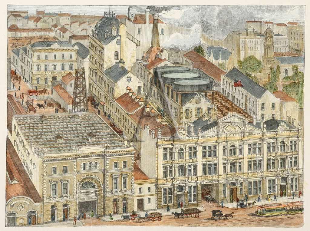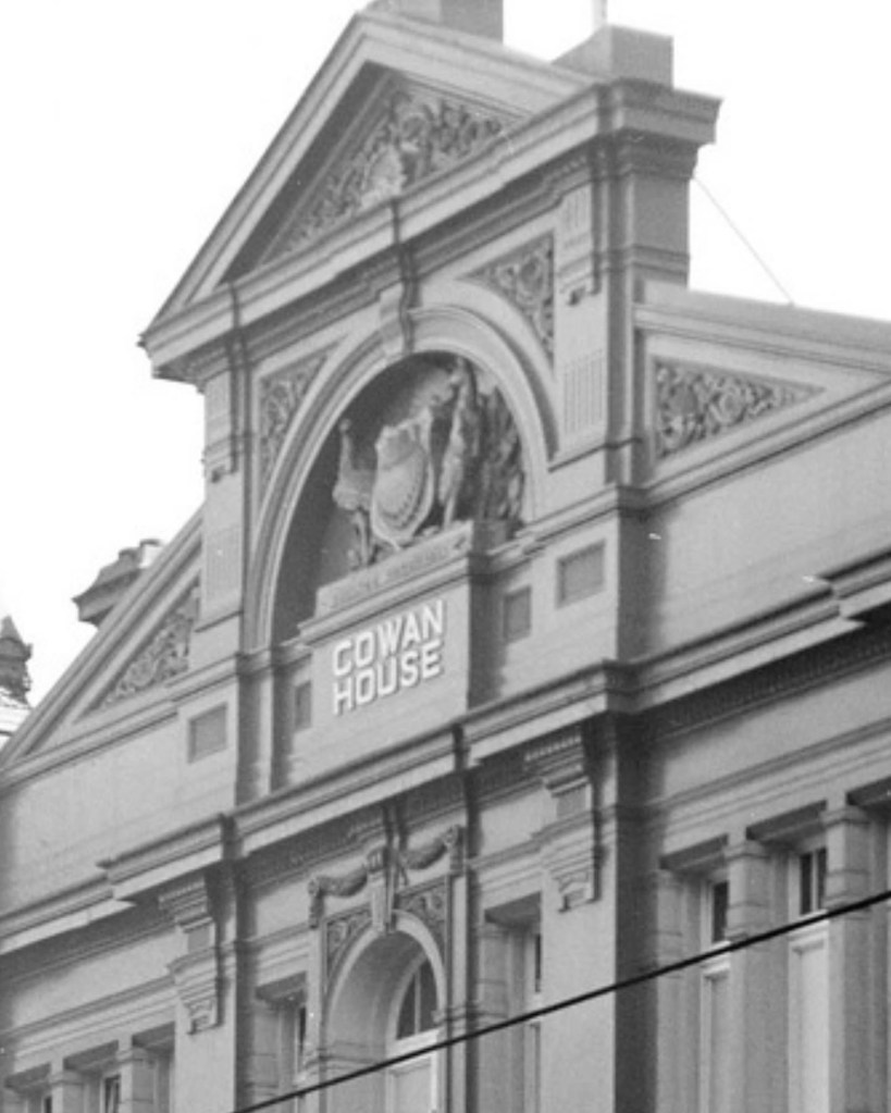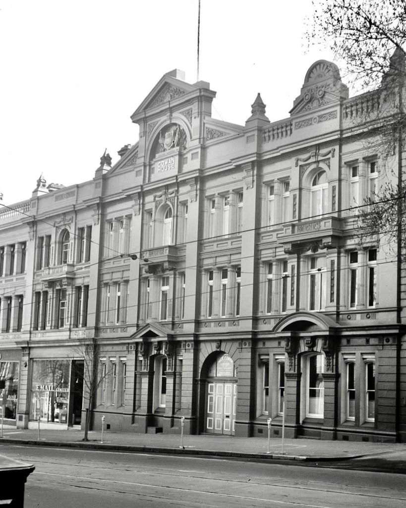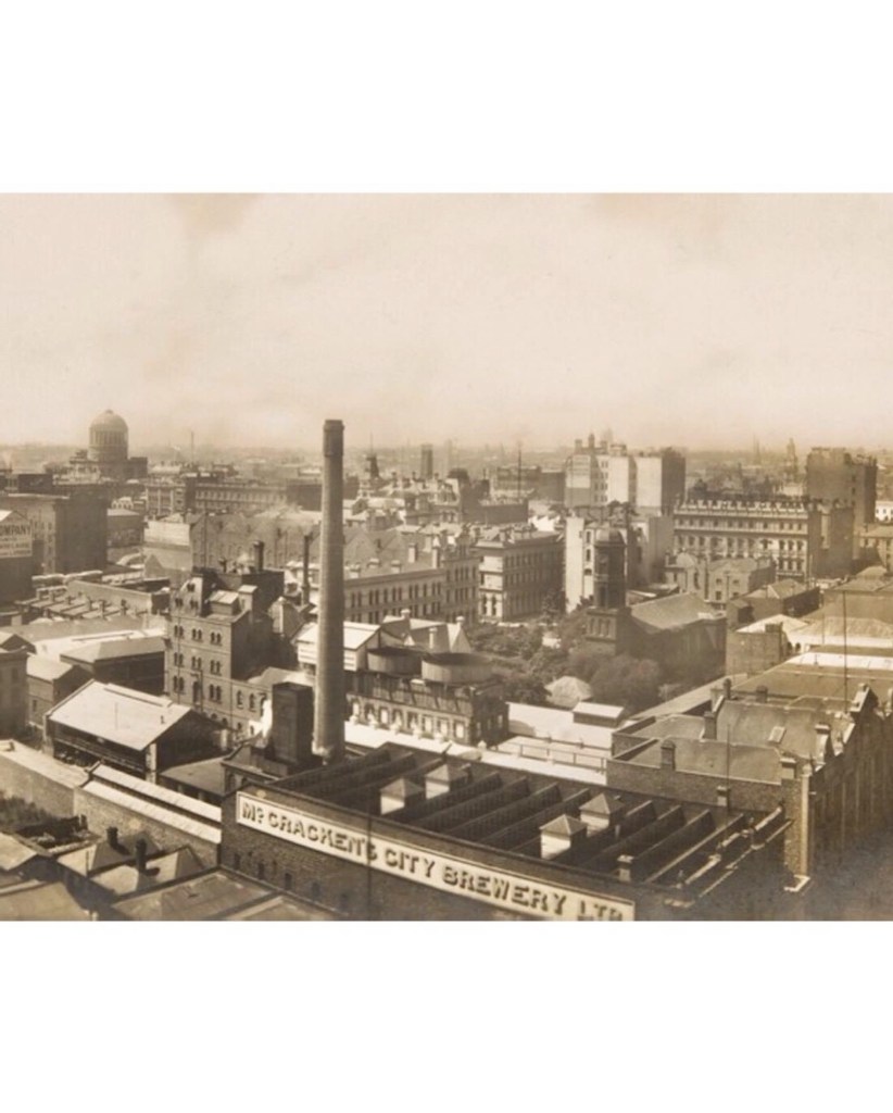 Found a photo of #McCrackensBrewery (a Halla snap from the late 60s). The Collins Street front was built in 1883, and designed by #ReedHendersonAndSmart; it was added to a complex that faced Little Collins it seems. The brewery started in 1851, not sure if here at first though, but def by the 1870s. A store was added in 1879 in Little Collins, the only part now left, called Ebsworth House. A very modern looking part was added in 1907 just after it was taken over by CUB. The brewery part was demolished in the 30s, the main front lasted to the late 60s, complete with the ‘Australian’ Coat of Arms logo (before federation) in the parapet. It was generally known as the City Brewery rather than McCrackens. Early photos @library_vic, aerial photo @cityofmelbourne, other stuff from beer label collector websites.