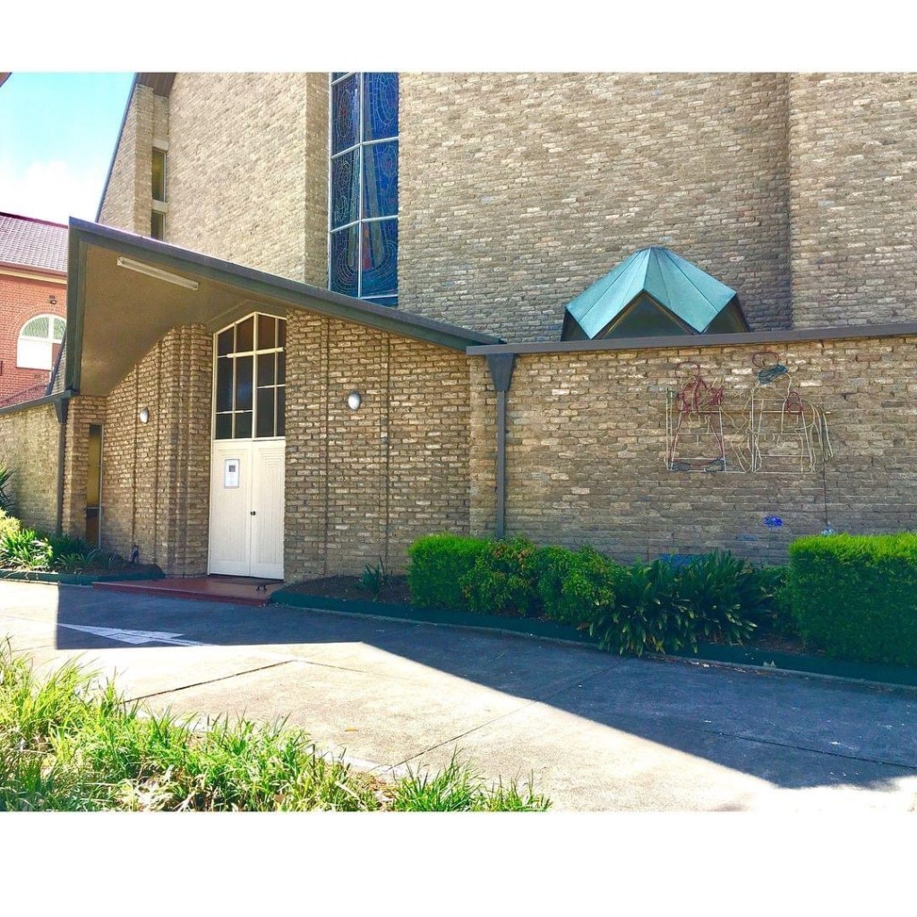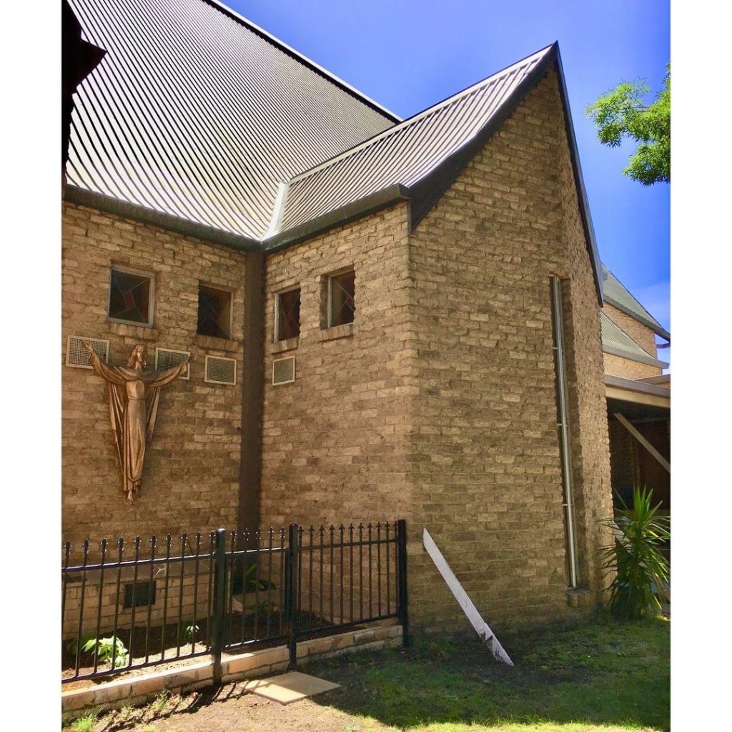 Holy Eucharist, East Malvern, #AlanGRobertson, 1962. So many odd choices, perhaps an example of what #HeritageVictoria would call ‘not well resolved’. Huge symmetrical front and thrusting angular entry porch, but then a bit to one side with a neat little hexagonal skylight over the #baptistery; the whole thing starts tall and ends up low over the altar; side chapels as bays with cross gables, concealing what look like ties holding down the roof (too small to hold it up) popping out near the ground, and those extra crunchy #bricks ! Or are they #concreteblocks ? Or #concrerebricks ? Once a landmark on Dandenong Road, the native tees around it now obscure it.