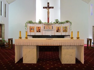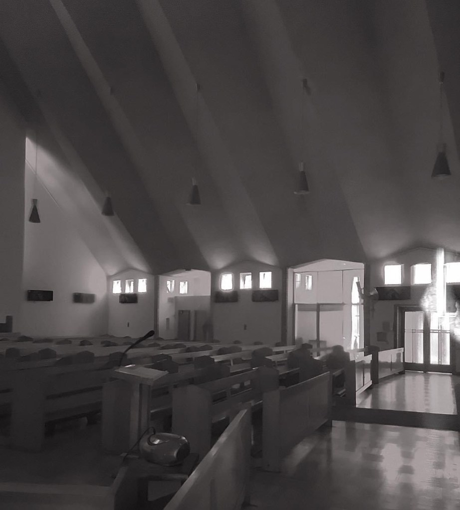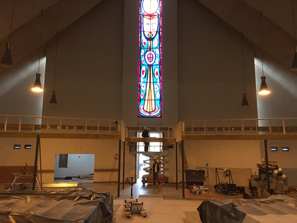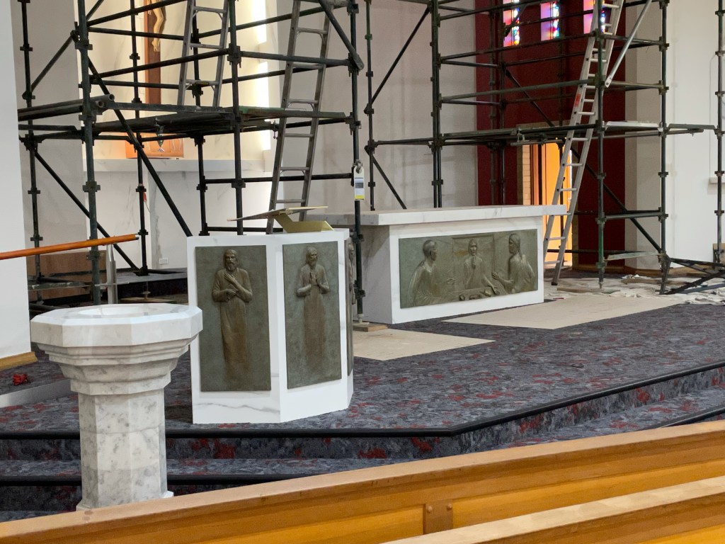 In 2020-21 it was refurbished, fortunately without destroying its character, partitioning off sections at the entry for a chapel and meeting room, and a new sanctuary, losing the original angular reredos (rear last pic), but for a similar marble thing. They even kept the lights. Pics of works and altar from parish newsletter.