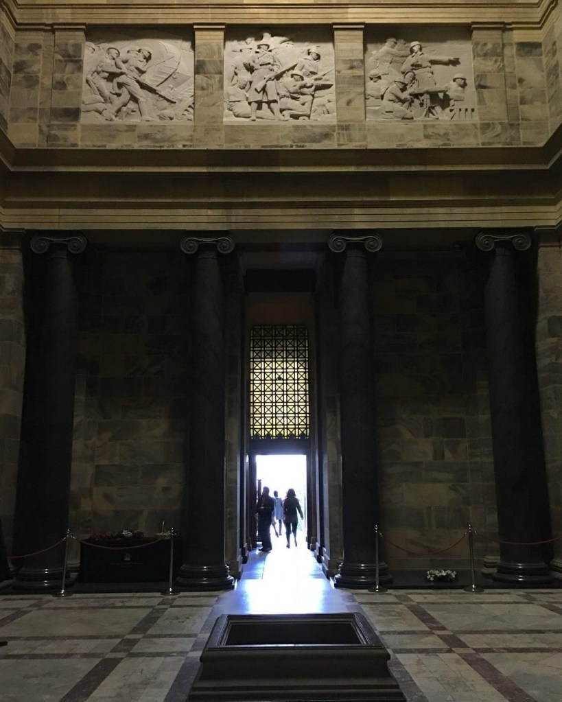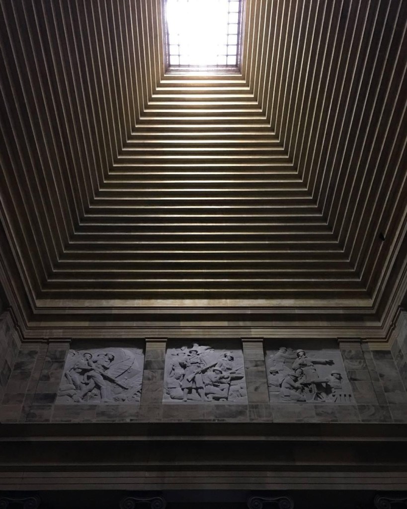 ShrineofRembrance, 1927-34, #HudsonandWardrop, the chamber- seen this photo so often always thought they were on a special day or special lighting, but that’s exactly what it looks like (it’s a strong light above a fake #skylight). The inside of an outside stepped pyramidal top that’s based on the ancient wonder the Mausaleum of Harlicanassus, even though no one knows exact what it looked like. There’s a great coffered ceiling in the room below, suitably sepulchral, though the antique painted finishes remind me of 1920s cinemas.