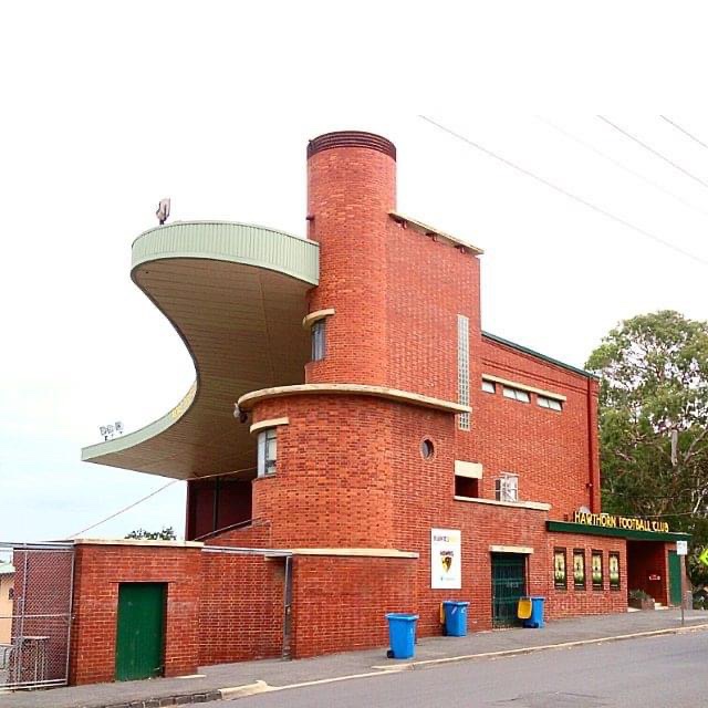 Making a #curvaliscious impression in the gentle streetscape of suburban #hawthorn – the #GlenferrieOval, built 1938, designed by Stuart P Calder with Marsh and Michaelson. A landmark of #artdecomelbourne, or #streamlinedmoderne if you prefer, influenced by some of the more striking curved European #earlymodern designs, as much as by the need for a curved plan and commentary box (at least I think that’s what it is). The roof was originally thin concrete (probably). Adventurous design for a footy club! Since 1992 it’s been named after Hawthorn legend Michael Tuck, the same year it was added to the Heritage Register.