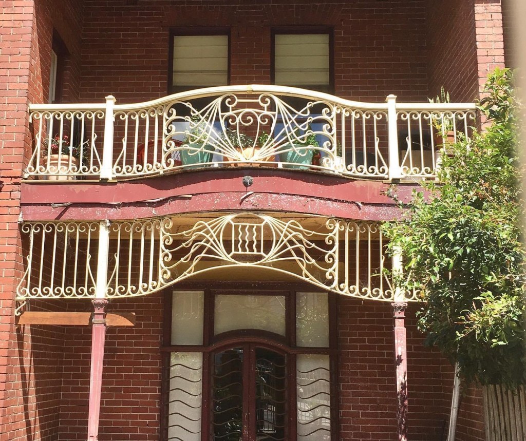 A very interesting #housepair on Grey Street- built 1910, designer unknown, and built for Ann Godfrey as an investment. Some Dutch /QueenAnne #steppedgables and some almost #ArtNouveau #wrought-iron (which looks rather Robert Haddon). Unfortunately some poor repointing in one gable, on grey instead of beige ! Not sure who owns, possibly the Salvos, but one houses their St Kilda crisis service.