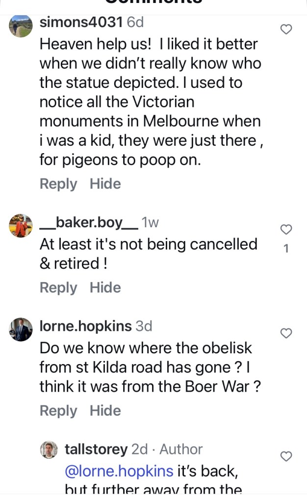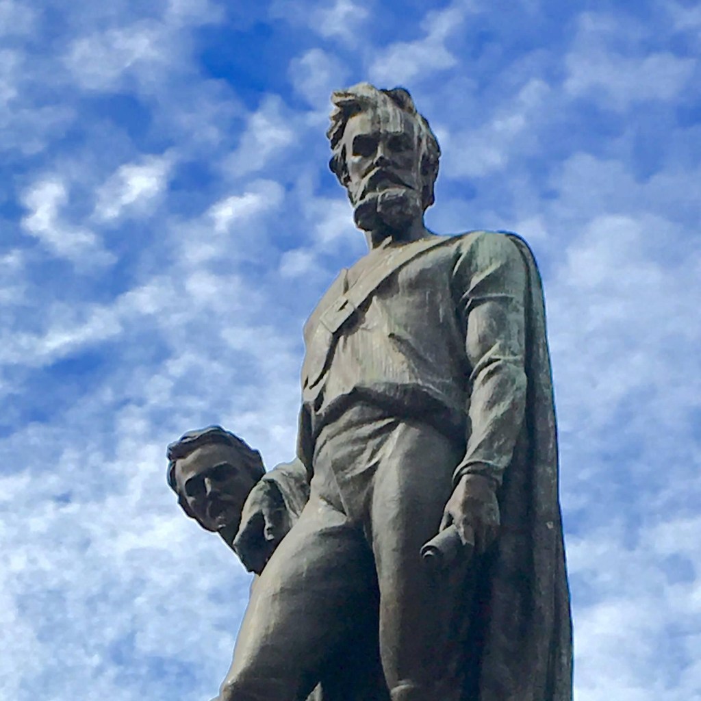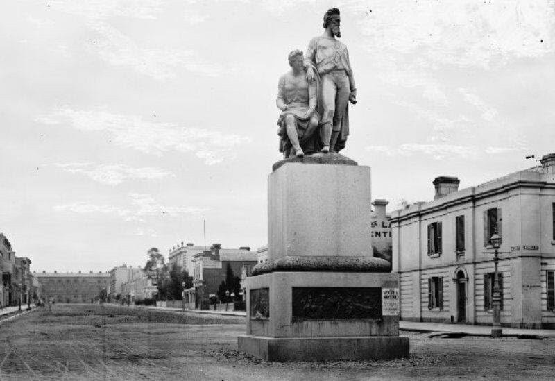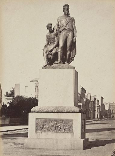 The heroic statue / monument to the ill fated explorers Burke & Wills, who died in the desert after trekking from Melbourne to the north coast of Australia (and not finding an inland sea). That was 1861, and this, Melbourne’s first major public monument (that wasn’t imported) was cast by eminent sculptor #CharlesSummers in 1865. It’s been moved 5 times, and is about to move again (to storage to allow the city square to be dug up for the melbourne metro project). The original location was the middle of the intersection of #Collinsstreet and Russell street, at the top of the rise just to the left here, where it would have looked quite majestic; and now I wonder why he made the figures face away from the main view to the south, looks great but means their faces are in shadow, especially Wills, cast literally as the minor partner, peeping behind Burke’s cloak.