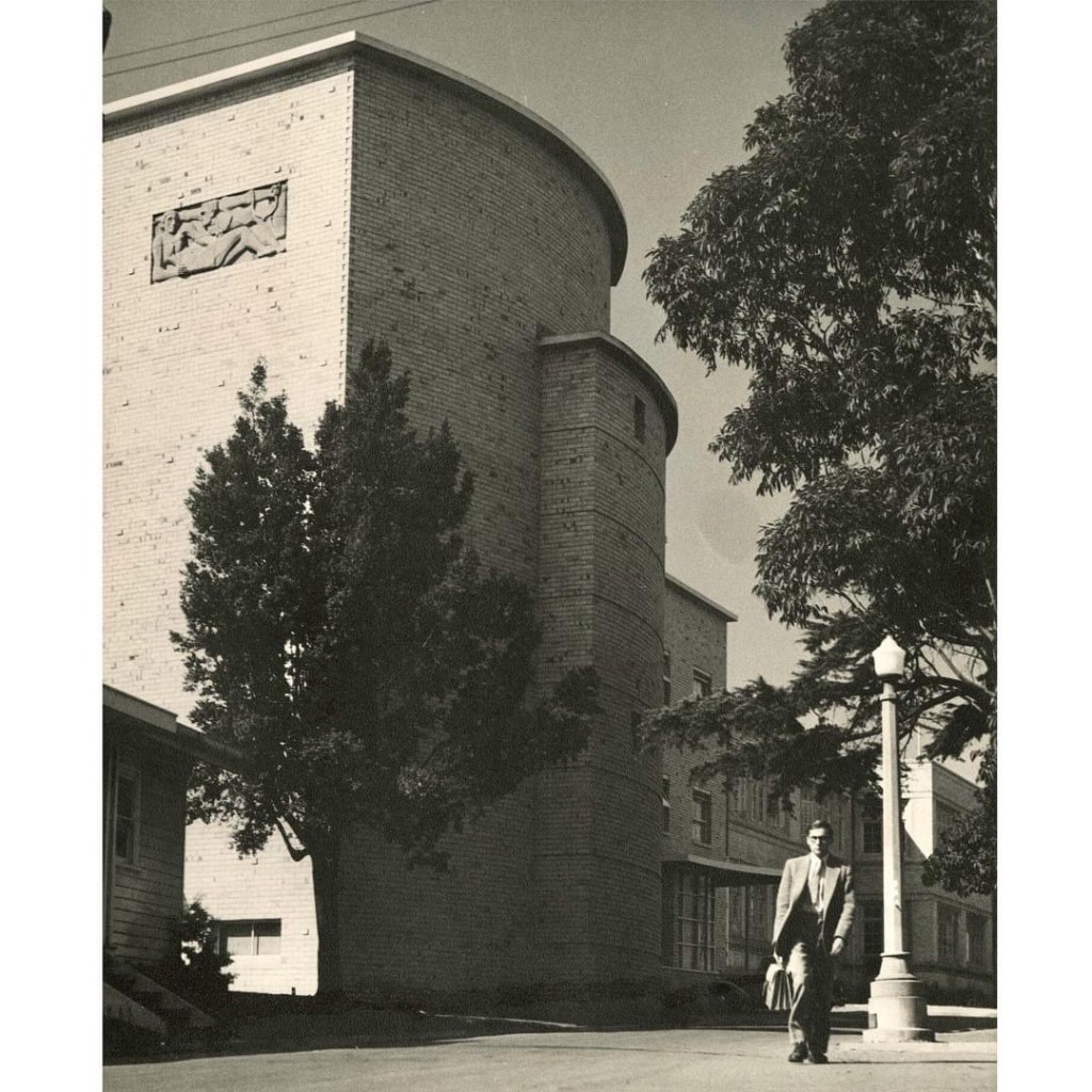 A bit of #creambrick #bauhaus in Melbs, poorly treated – the #BabelBuilding at #MelbourneUniversity, so nicknamed by students cos it housed foreign languages, then made official. Built straight after the war, 1946-48. Only three floors then, designed in very European #modernist form by #GodfreySpowersHughesMewtonandLobb (so many partners !); in 1956-57 they added two almost matching floors (but #stripwindows this time) even a matching curved #lecturetheatre, and also the foreground section – the original must’ve been pretty small. Awful extra floors added in 2001. The 1948 building had a panel of stylised figures which was soon removed cos they were nude ! But so high up and you really can’t tell what’s going on. @ The University of Melbourne