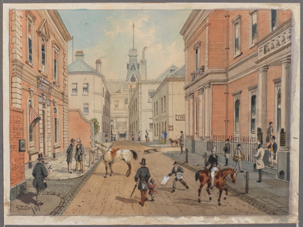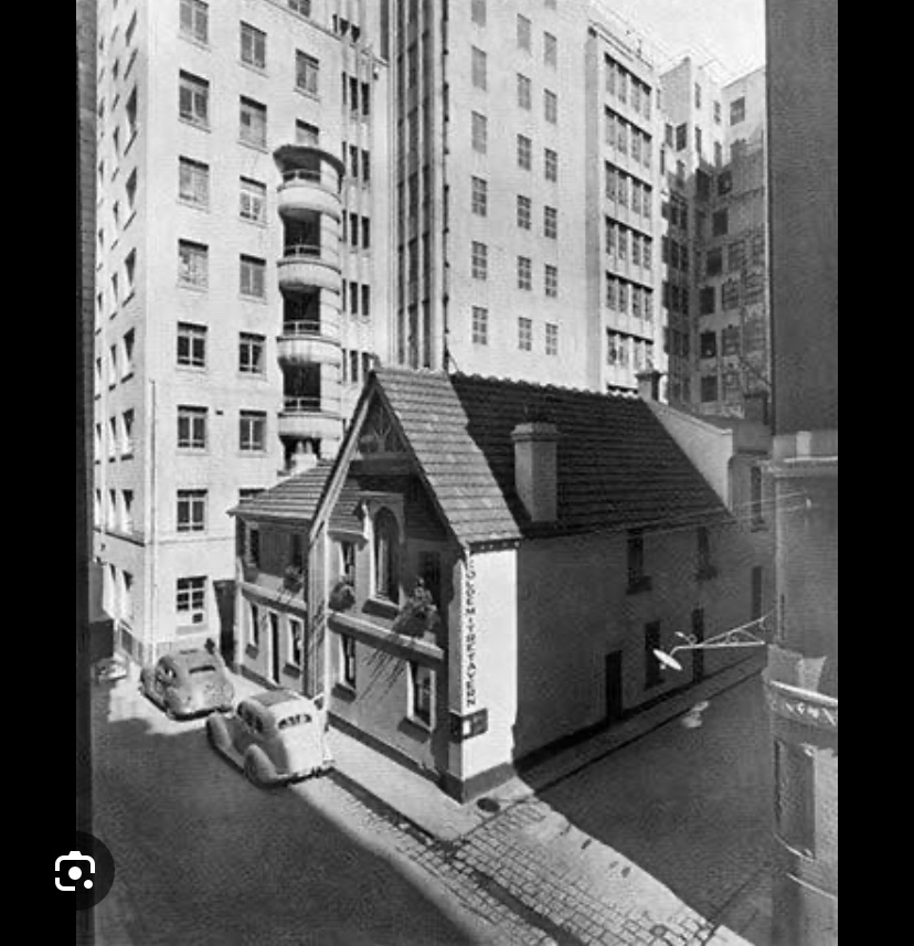 Ye Olde Mitre Tavern in #BankPlace, looking like a bit of Merrie Auld England in 1972. Lots of stories attach to this place, probably because it’s an odd little house sized building in a tight lane surrounded by older but much taller buildings, but few are true. It’s said to be one of the oldest pubs in melbourne, but it opened in 1868, and there’s loads of pubs from the 1850s. Its also said to be the oldest building, from the 1830s, but nobody knows for sure. It is however clearly made out of a bunch of houses, you can see symmetrical sets of windows, so they could be 1840s (they do have rather low ceilings). The Queen Anne style gable and windows is clearly Edwardian (terracotta tiles and Art Nouveau lead light), but again nobody knows date or architect (but it was sold c1904). So before that it was just some houses joined together serving beer etc. I found a lovely sketch by ST Gill from 1880 which looks a lot like Bank Place, that’s it on the right I’m sure, before it got the gabled roof. It was used very often for meeting of all sorts, various clubs and societies met there it seems right through to the 1920s, then it was just a favourite of the nearby legal fraternity. Before all the umbrella clutter it was very photogenic – pics 2, 3,4 are all 1930 when it was sold, generating news stories about how old and olde worlde it was (forgetting it was done over 30 years before). Then there’s a pic from c2000. Interior shots from their website, these are the only bits that look old to me, probably Edwardian. Another story is that Mitre 10 was founded here, but the company website says no. And of course there’s a ghost; supposedly the jilted mistress of Sir Rupert Clarke, but his townhouse was across the lane, and she didn’t live there, and never committed suicide anyway, myth busted by the #deadabnburied podcast.