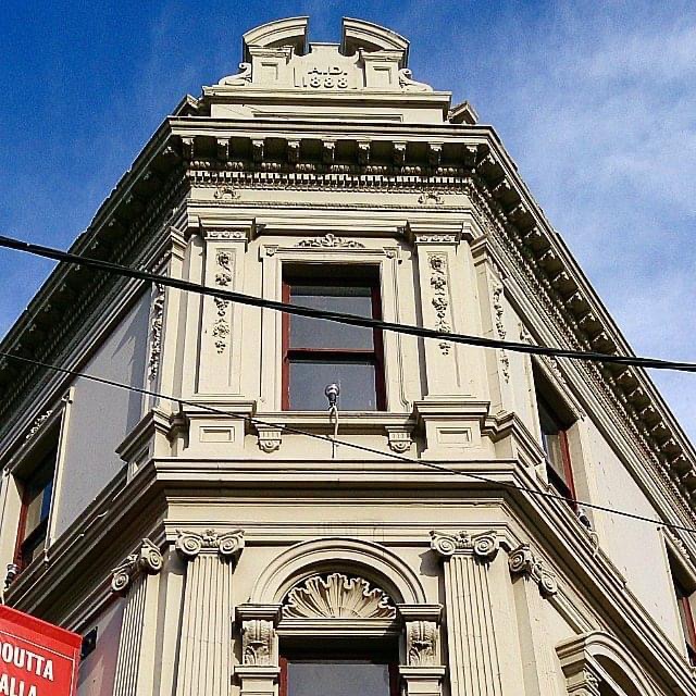 DouttaGallaHotel 1888, great elegant detailing of the #splayedcorner. Clamshell above first floor window, delicate foliation on the panels above, topped by a #brokenpediment. Intact side entry, probably originally access to the residential floors above.