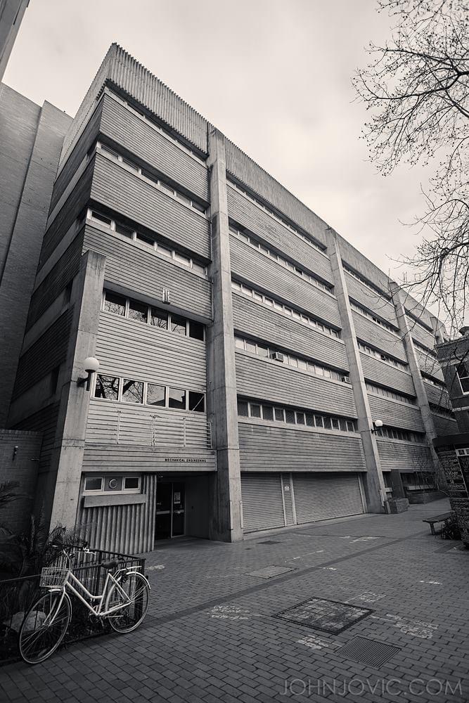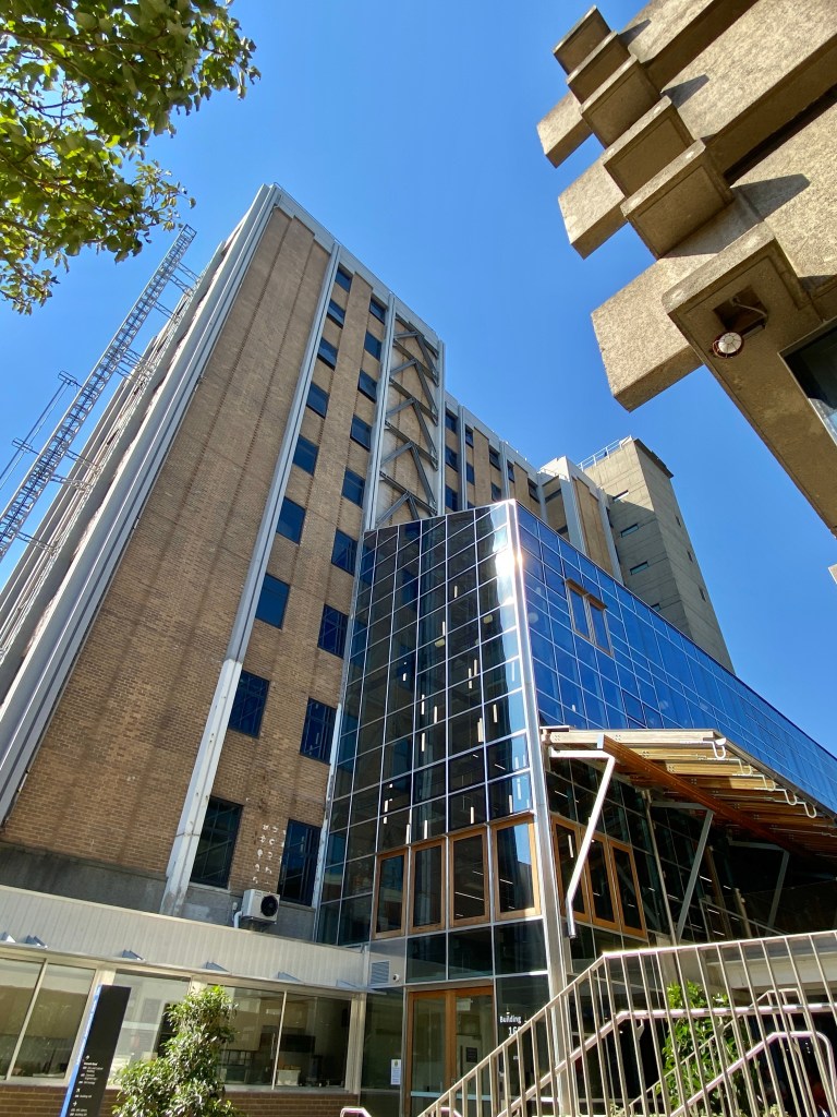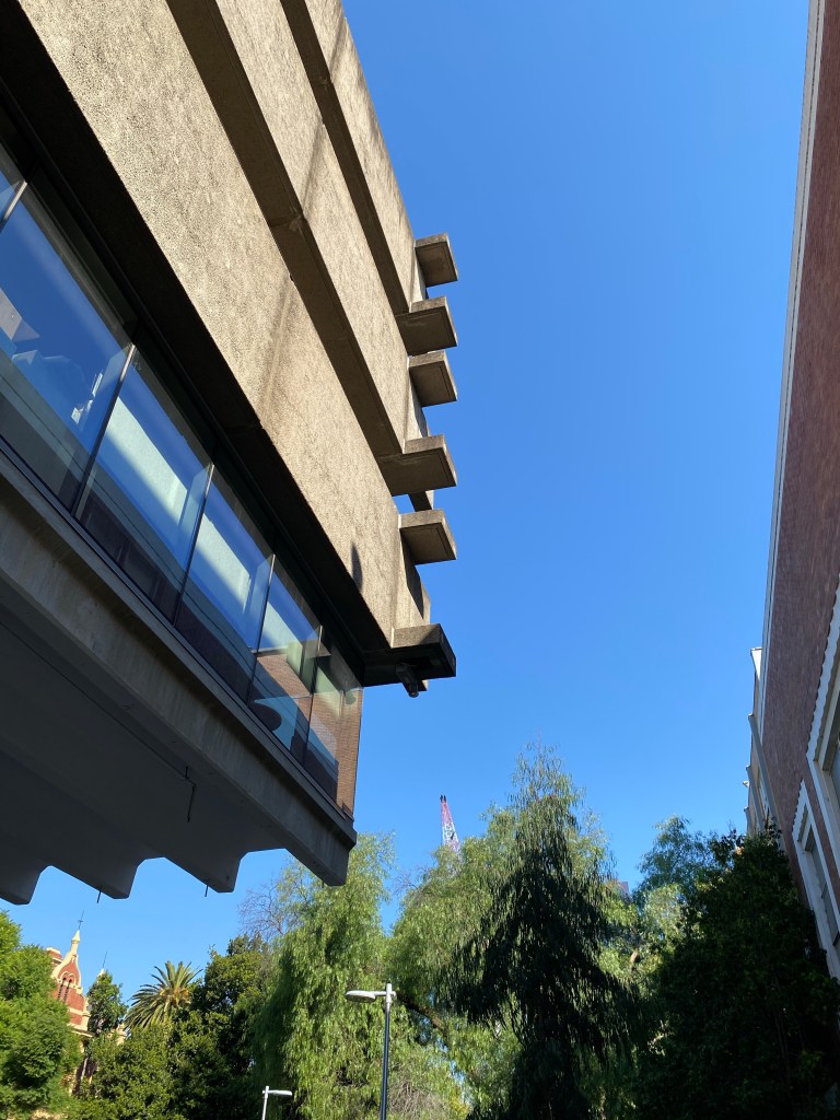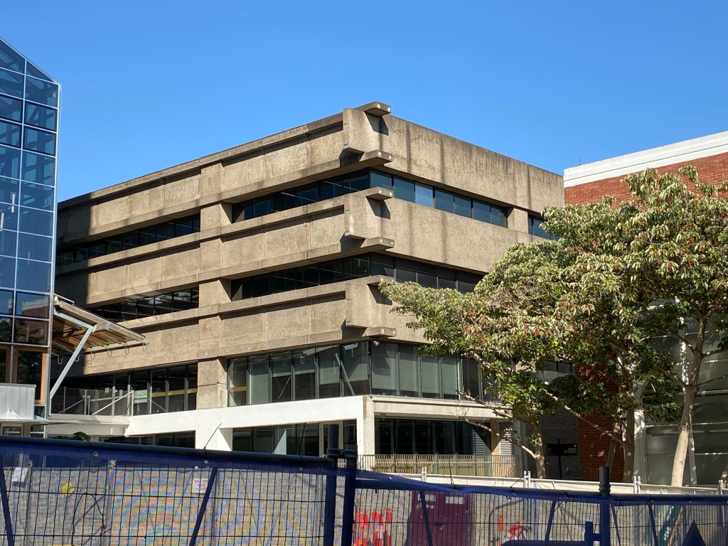 Update 2024: went to see what had happened to it with the redevelopment of the area as the new Student Precinct. It’s not intact now, but the important bits, namely those interlocking beam things, are unchanged. And looking closely they’re actually in big precast bits that arnt structural, must be essentially cladding. They’ve cut away the ground level at the south and west sides, increasing the open space, and revealing the probably precast post tensioned floor beams, cantilevering out (actually held up from above). The work on this building was by @lyonsarchitecture. I like it.
