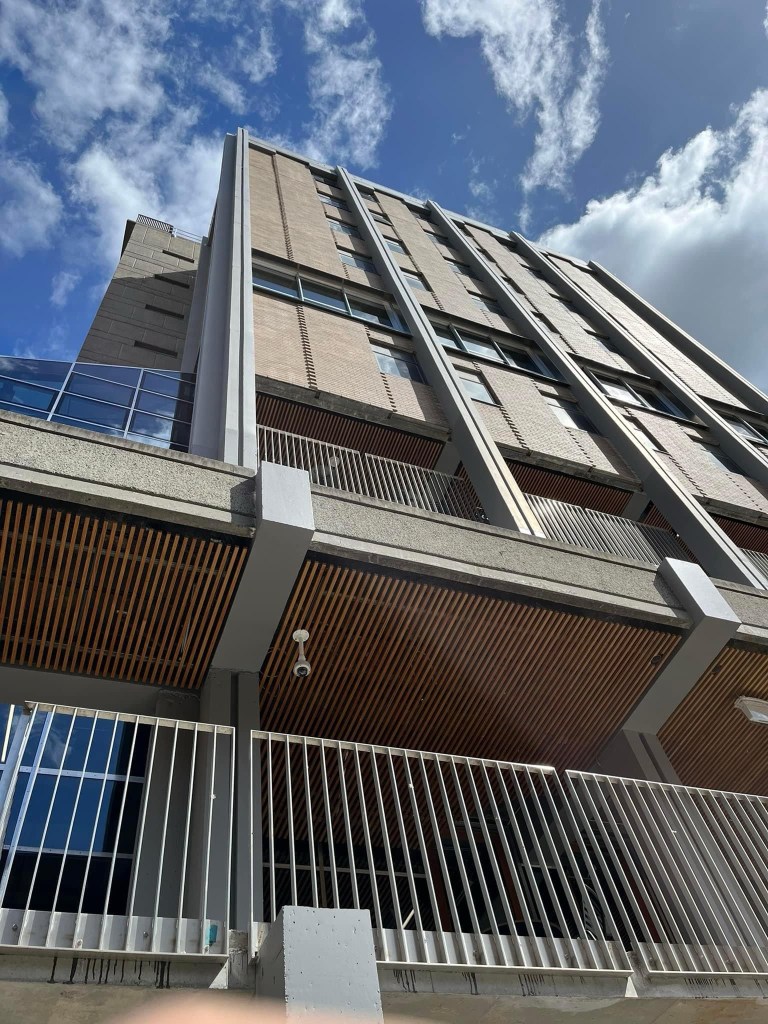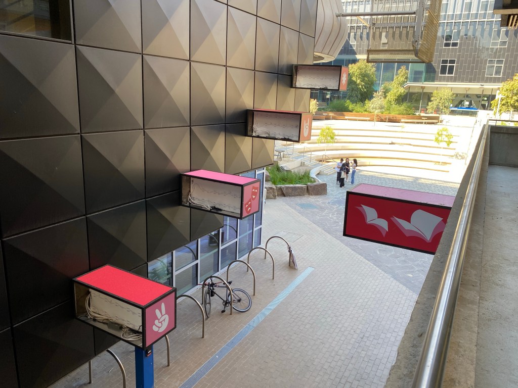 A bit of a Brutalist makeover – this tower at Melbourne University was built for the Teachers College in 1970, designed by the Public Works Department in a soft and not terribly exciting bricky version of Brutalism. As part of the Student Precinct it’s been redone by @nmbw_architecture_studio, opening it up for a few levels, sort of looks full of holes, but that’s ok. The west side seem unchanged, while the south side has a big atrium added (and some bracing, possibly earthquake upgrade). On the north side it’s connected to the new Arts & Culture building across a narrow space with angled walkways, quite a bit of fun. There’s signage there that looking from behind don’t have backs, not sure if that’s intentional. I’ve got a lot more to post about the precinct, basically I don’t like the new buildings much, but the landscaping is very impressive.