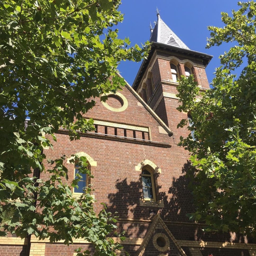 The former #FaradayStreetStateSchool was built in 1876 and has so many #damntrees in front you can hardly see it! Great #polychromebrick #GothicRevival design by #JosephReedArchitect, one of the many 1872 completion winners for schools when Victoria started free and compulsory education. This was the only one of this design built though, except for three single storey versions which arnt nearly as nice. Like most of these schools, the original narrow windows have mostly been replaced so long ago you can’t tell anymore. Supposedly inspired by the famous 1850s University Museum Oxford, but this is far more #picturesque. Refurbished in 2015 as the #Carlton #communitycentre, named after Kathleen Syme, a noted journalist/editor (one of those Symes) and champion of women’s education. Second 2 interior pics @cityofmelbourne.