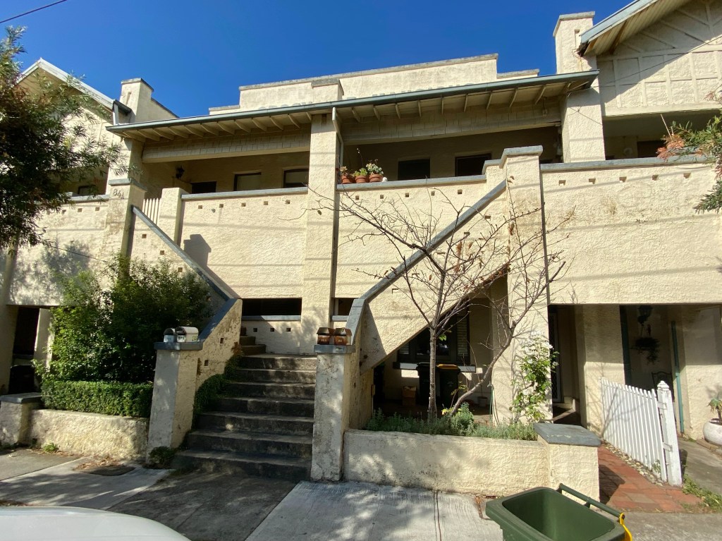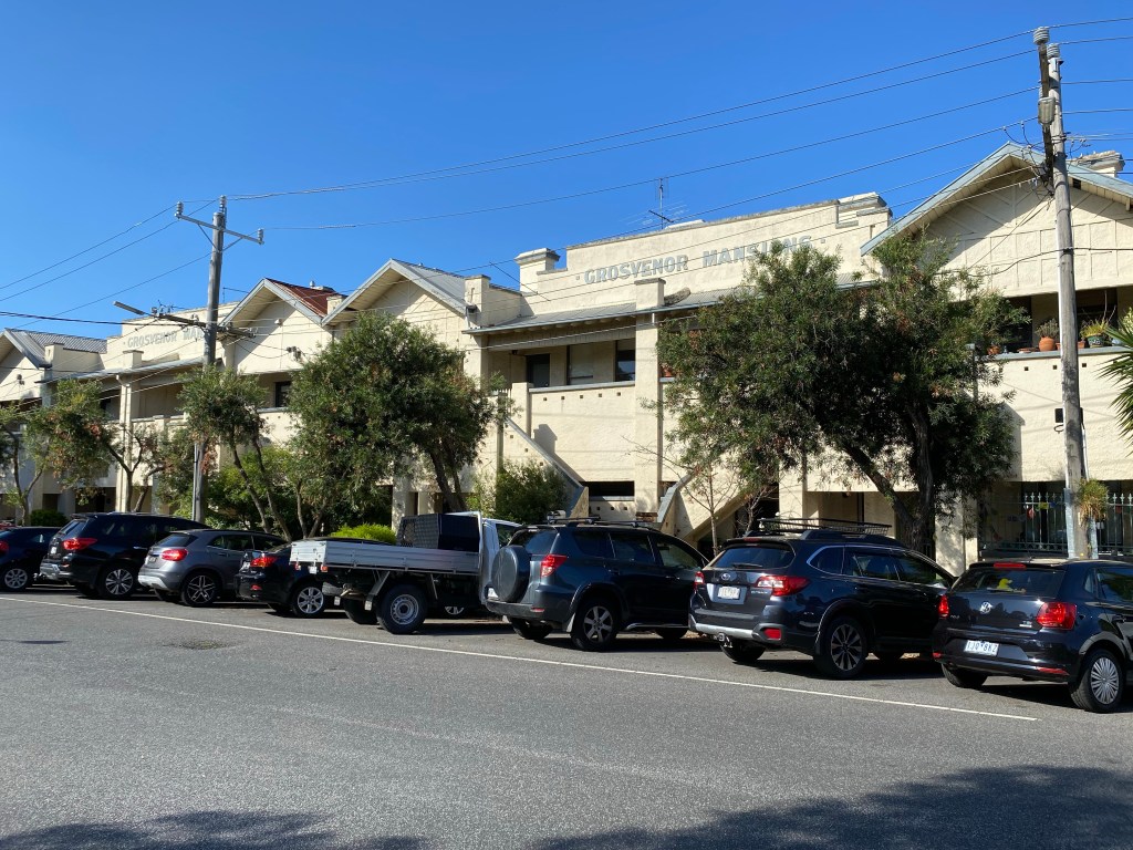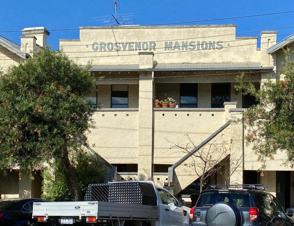 Grosvenor Mansions, William Street, Balaclava, an early-ish example of the conversion of Victorian terraces into flats from 1919. Designed by architect/ developer Howard Lawson (who went on to develop Beverley Hills South Yarra in the 30s), the work ‘increased the rental return three-fold’. I just happened to be going passed these and recognised them from a 1983 melb uni archi school report I looked at in the early 90s about early flats in Melbourne by Terry Sawyer. I’ve copied the before and after photos in that report. Looks like they still have one owner, no sales and looking a bit run down.