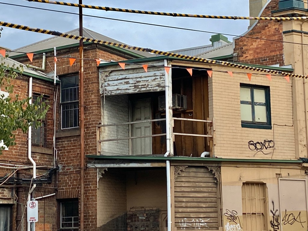 The sex shop on Acland Street left this little Victorian shop some time ago, looks terrible – but the interesting thing is that the rear, all exposed because it’s a corner, is very intact, with nice brown bricks and verandah, complete with cast iron, which looks to have been larger upstairs, part infilled in at some point. And under all the paint, the shop windows look to intact 1910s or 1920s too, hope they stay ! Another interesting point is that this was the only shop on Acland street in the 19thC – the rest down to Barkly was terraces and big houses in big gardens (and a cable tram barn); some of the terraces had shops built on the fronts (like the ones right next door), but mostly the shops were built new after 1900, some nice art deco ones, with flats upstairs, and some are 60s/70s.