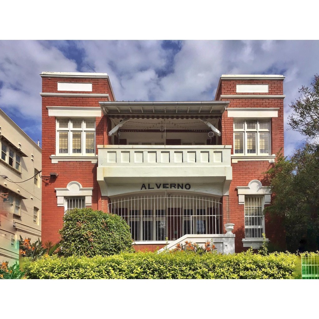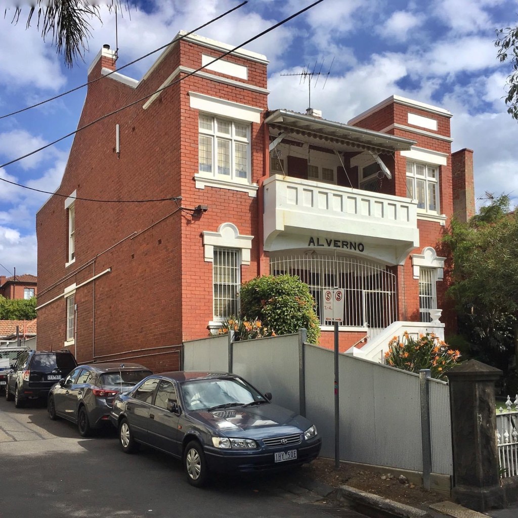 #Alverno, #DalgetyStreet, #StKilda, built 1918 for Miss Hoffman. Next door is an Edwardian house same date probably, and both were once part of the garden of the big Victorian terrace further to the right. An example of #earlyflats, part Edwardian #redbrick, part #ArtsAndCraftsStyle, and rather formal. It’s one flat on top of another, with separate entrances. No real estate listings on line, I guess nobody wants to leave these probably quite spacious apartments.