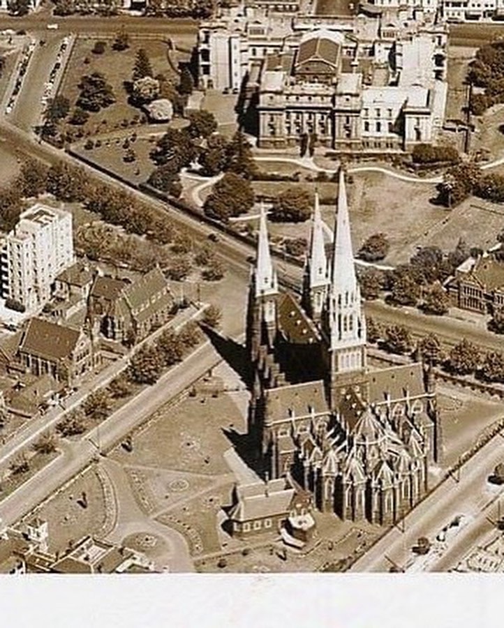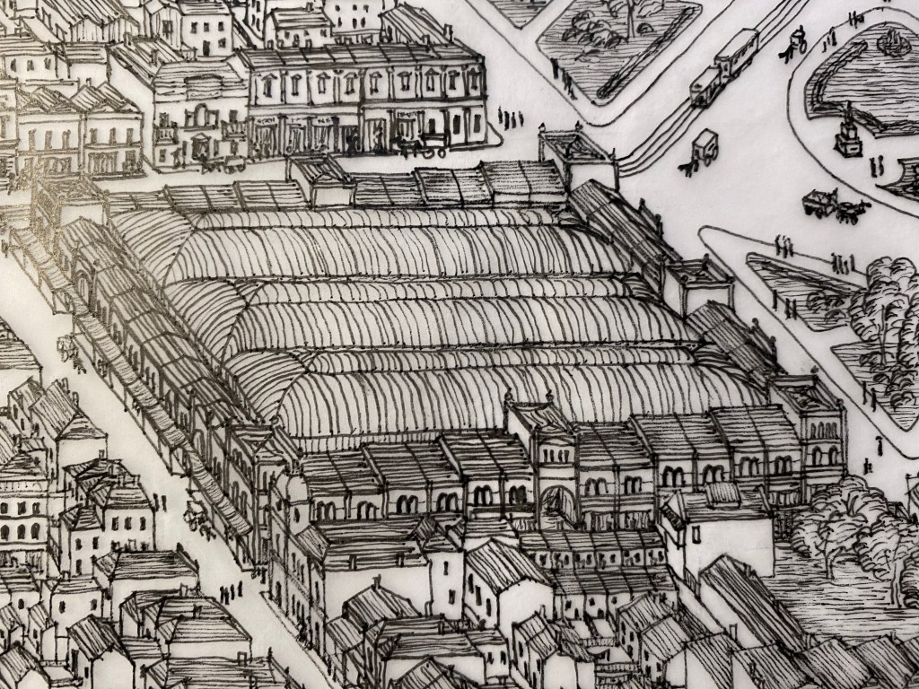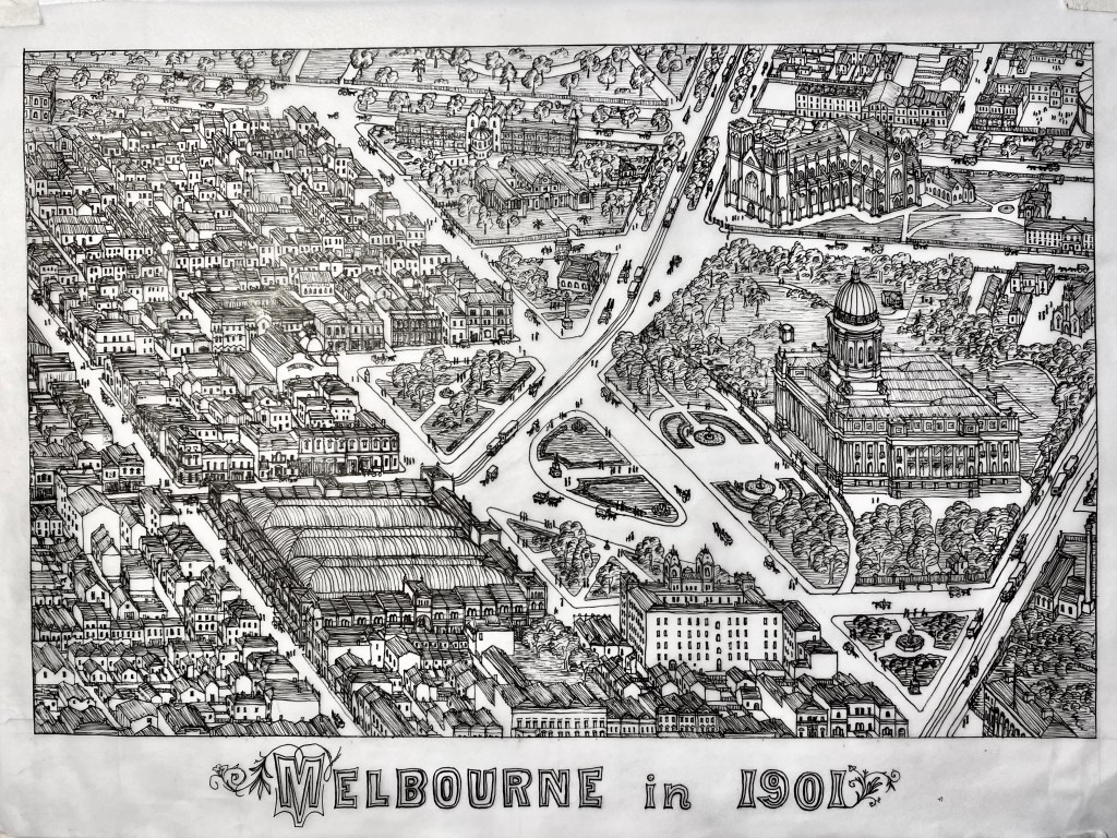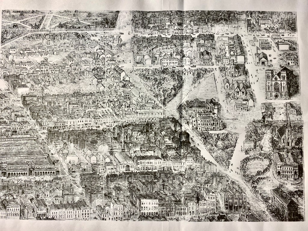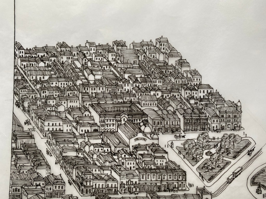 I had this print above my desk when I was a teenager – I guess mum got it for me, and where my heritage interest started ! It’s by Samuel Calvert, β€˜a birds eye view’, but i think entirely done from the ground, not a balloon. You can download a very large version from the @library_vic, and blow it up – I’ve shown some details of the Exhibition Building, Parliament House without its front, St Patricks without its spires, and the grand Eastern Market. You can see join marks and gaps, and just how wonky it is in parts eg Latrobe Street almost not there, and Victoria Parade looks parallel to Bourke Street. Lots of cute tiny horse and carts. I’m thinking of doing a version of that end but based on my plan of what Hoddle should have done, and Parliament House with it’s dome finished – do you think that would be worth it ?