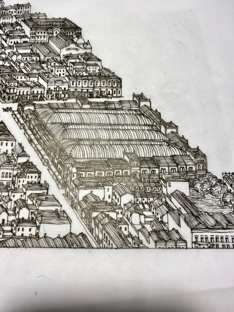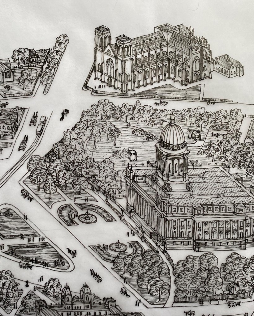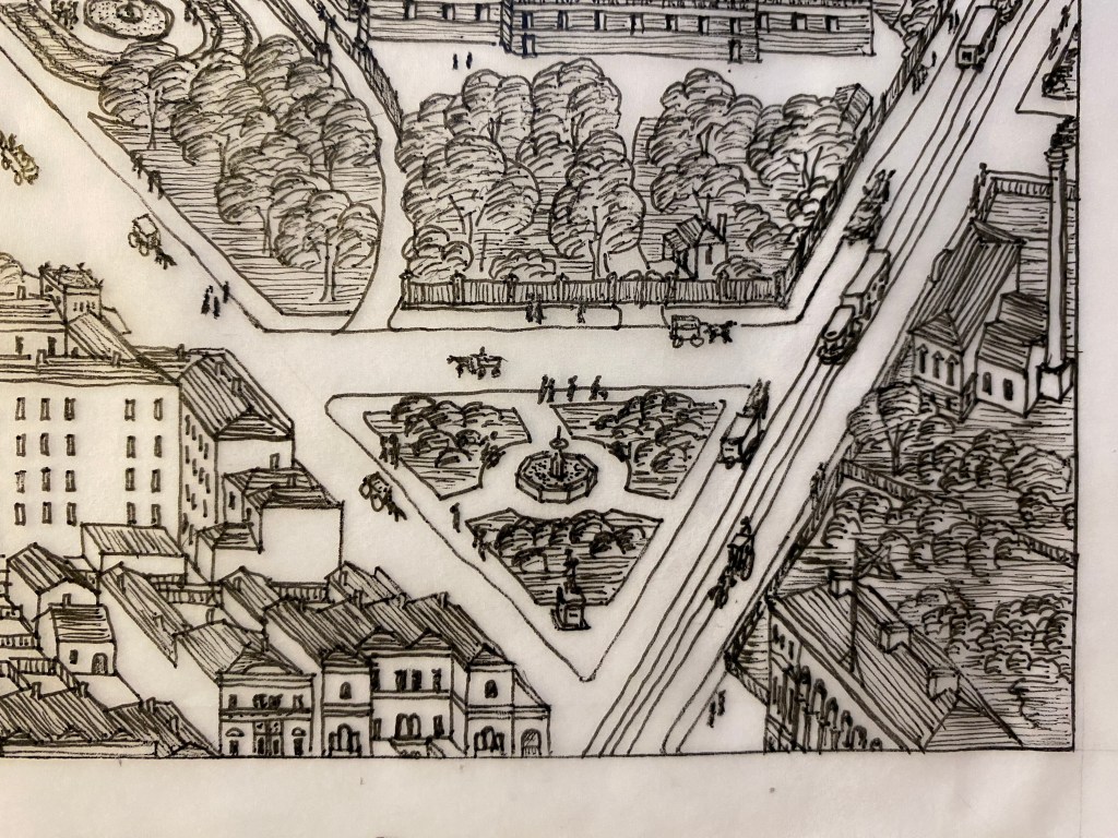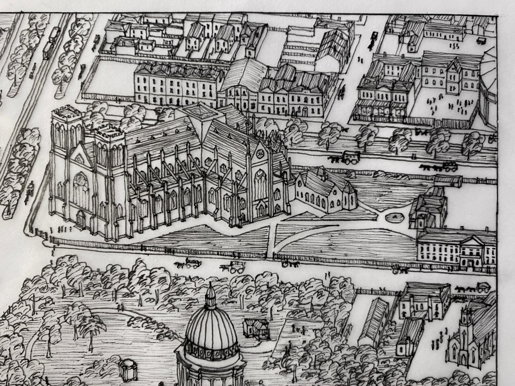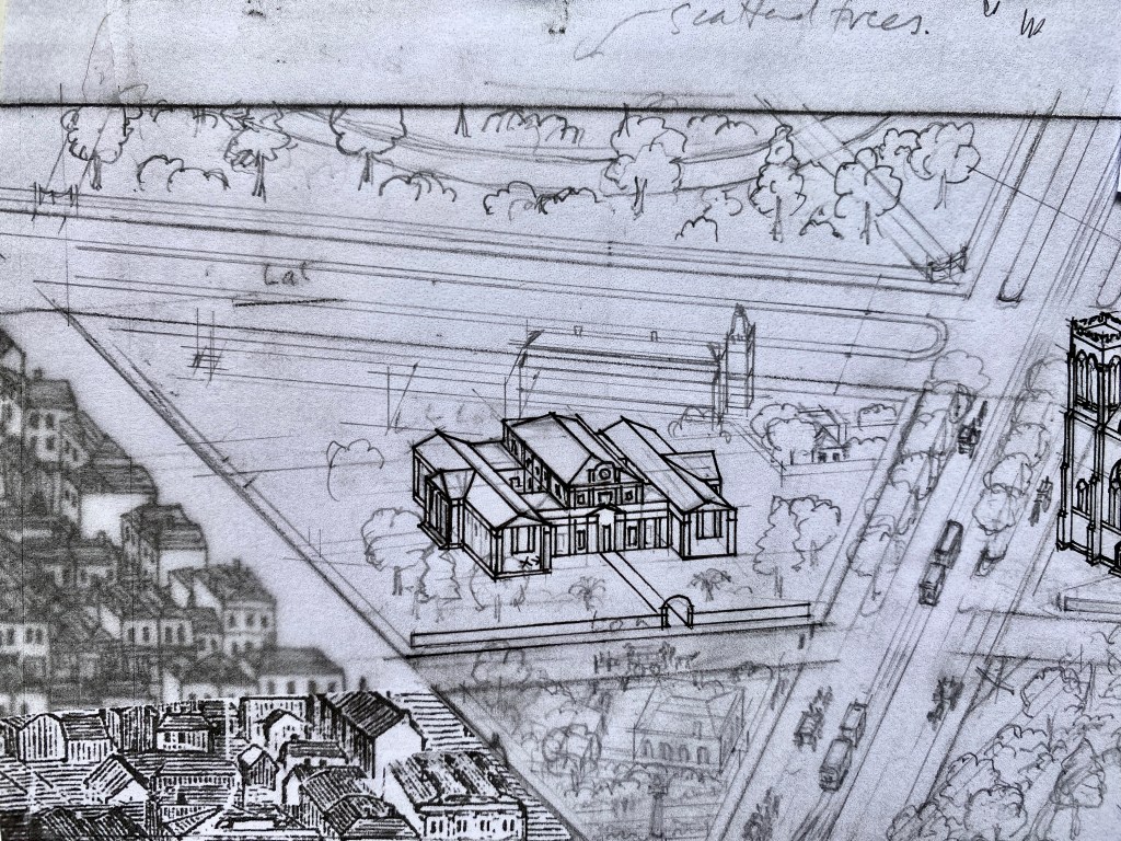 2 September 2023: And it’s finished ! My Melbourne as it might have been, if Hoddle had included public squares and more wide streets. So I’ve ended up with a park areas in front of Parliament House, which has a forecourt as well and with dome competed, and both Nicholson Street and Victoria Street as 198 ft boulevards. Im worried there’s not enough traffic – more horse and buggies ? (I can’t draw horses at all properly!). I’m not sure what to do next – a nice ink wash ? Leave as is ? And some details i maybe havnt shown before – the Homeopathic Hospital (from behind) facing the Carlton Gardens, the space in front of Parl House, with Burke & Wills statue, St Patrick’s Cathedral with adjacent College, Gordon Square with Stanford fountain, and the Eastern Market. It’s been fun, sad it’s over actually.