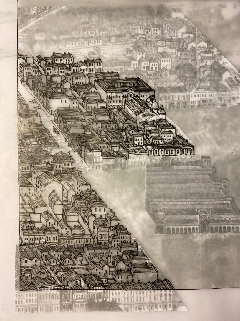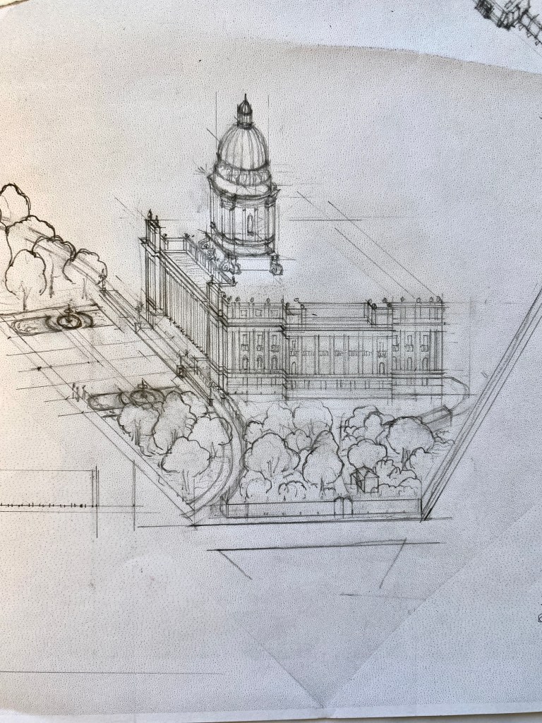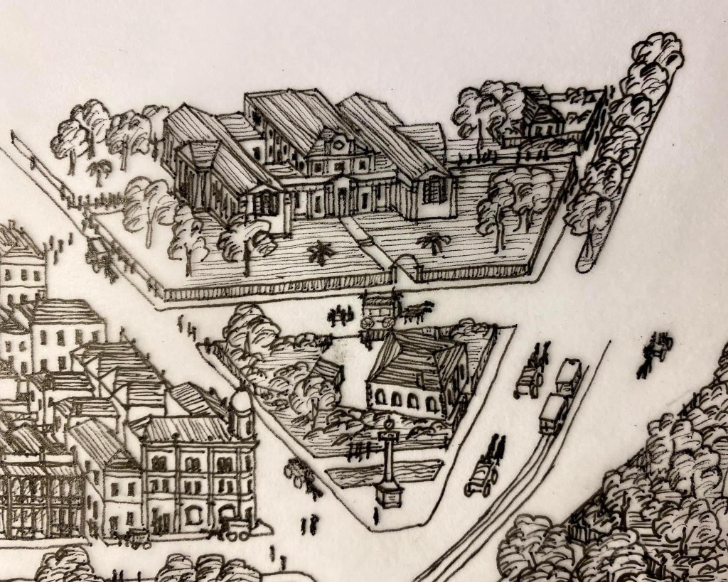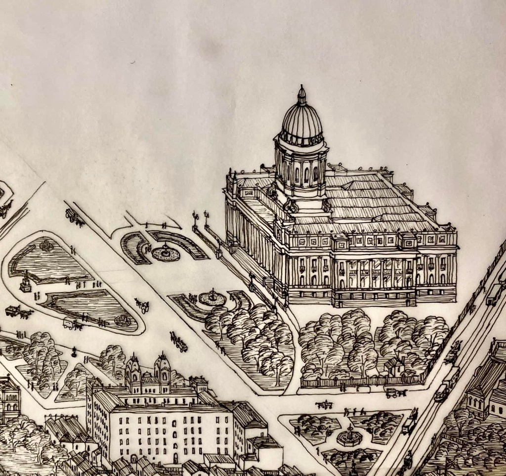 2 September 2023: And it’s finished ! My Melbourne as it might have been, if Hoddle had included public squares and more wide streets. So I’ve ended up with a park areas in front of Parliament House, which has a forecourt as well and with dome competed, and both Nicholson Street and Victoria Street as 198 ft boulevards. Im worried there’s not enough traffic – more horse and buggies ? (I can’t draw horses at all properly!). I’m not sure what to do next – a nice ink wash ? Leave as is ? And some details i maybe havnt shown before – the Homeopathic Hospital (from behind) facing the Carlton Gardens, the space in front of Parl House, with Burke & Wills statue, St Patrick’s Cathedral with adjacent College, Gordon Square with Stanford fountain, and the Eastern Market. It’s been fun, sad it’s over actually.