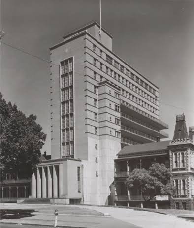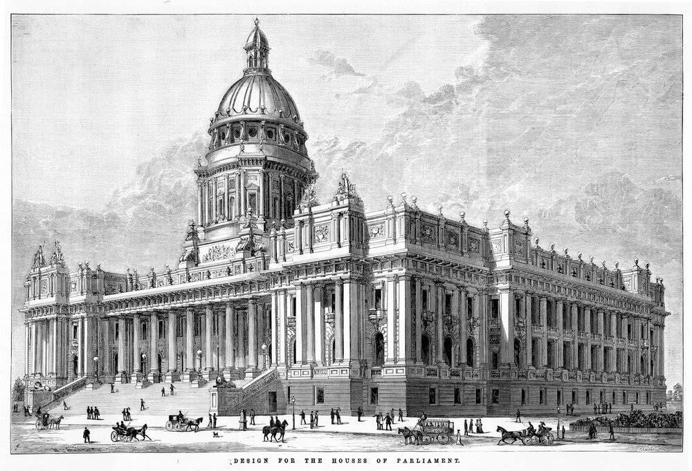 Parliament House with dome – it was quite elaborate, rather Baroque in style, with projecting diagonal bays on the drum, then tall brackets, and the dome itself was sort of scalloped. It was all drawn up perhaps about 1888, ready to go, but the 1890s crash got in the way.