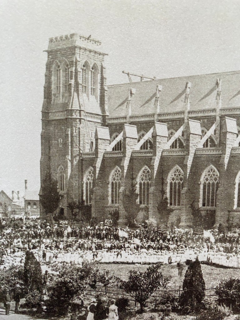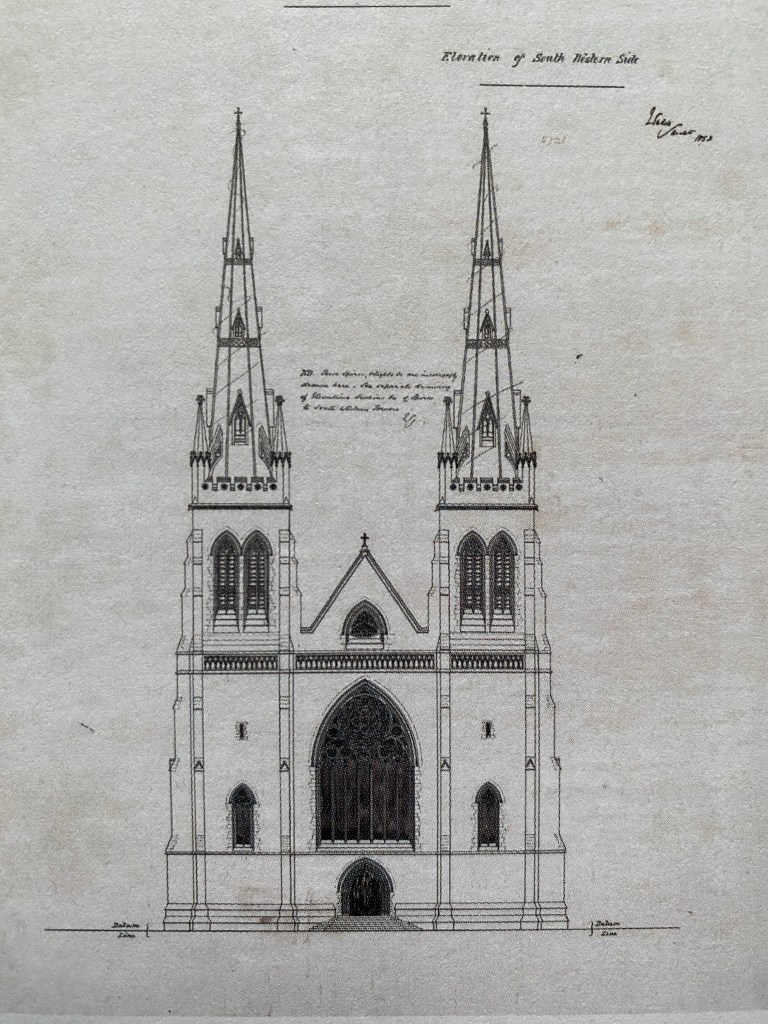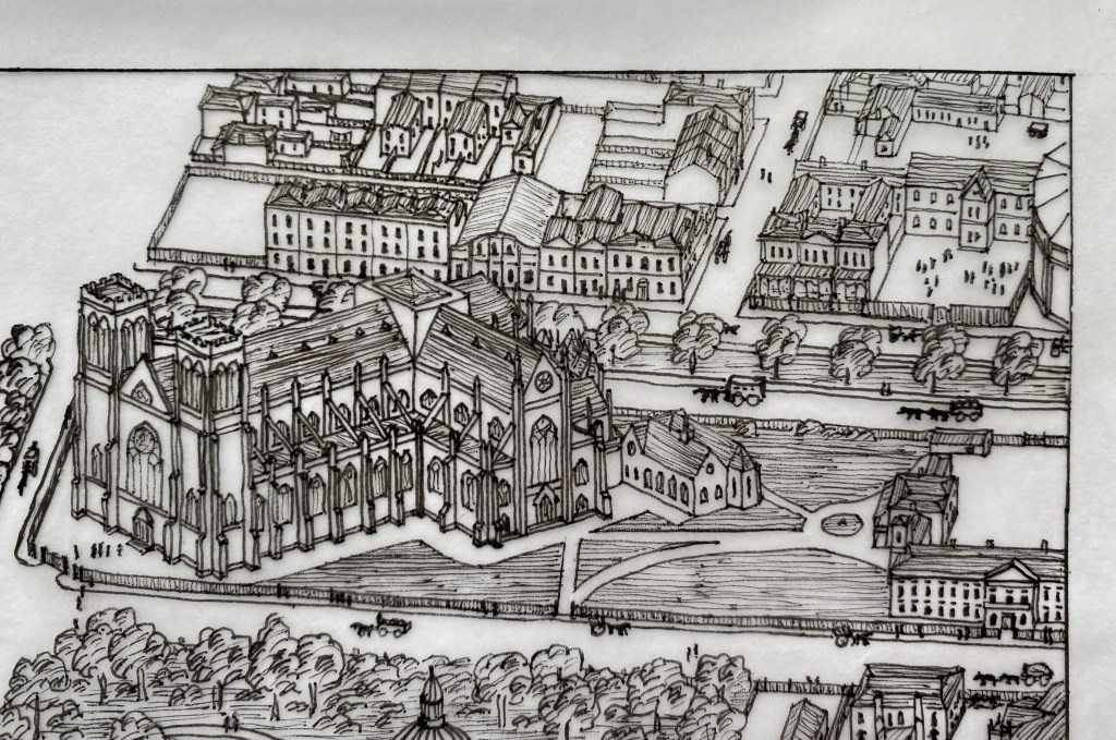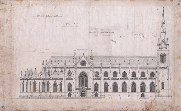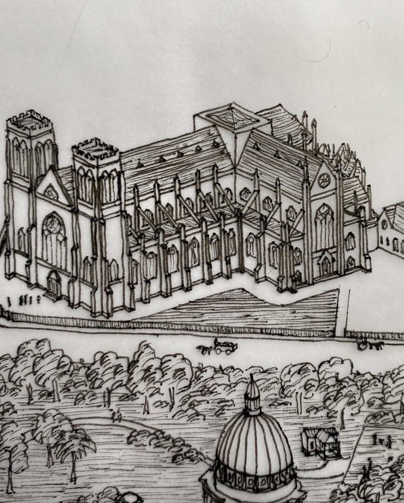 Latest instalment of my Melbourne as it might have been in 1900 birdseye view – drawing St Patricks so small was quite fiddly ! And though I’ve drawn Parliament House completed, I did St Pats without spires, which weren’t added till the 30s, though in 1900 one of the towers was lower for some reason. From old photos they didn’t plant any trees around it. And I appreciate its architecture more looking at the plans, though the detail of the really quite interesting buttresses is lost looking at them because it’s all dark bluestone. Wonder who and why they chose bluestone? Guess in 1858 it was definitely cheaper.