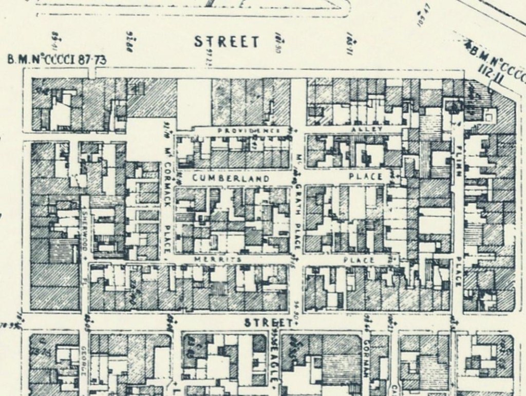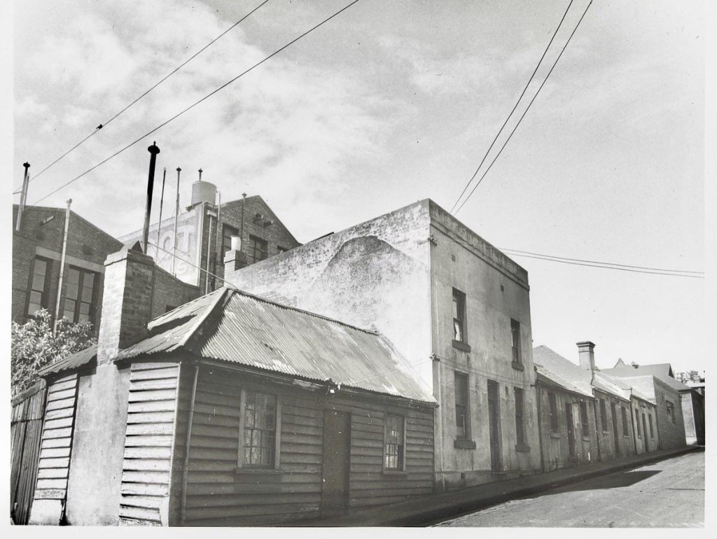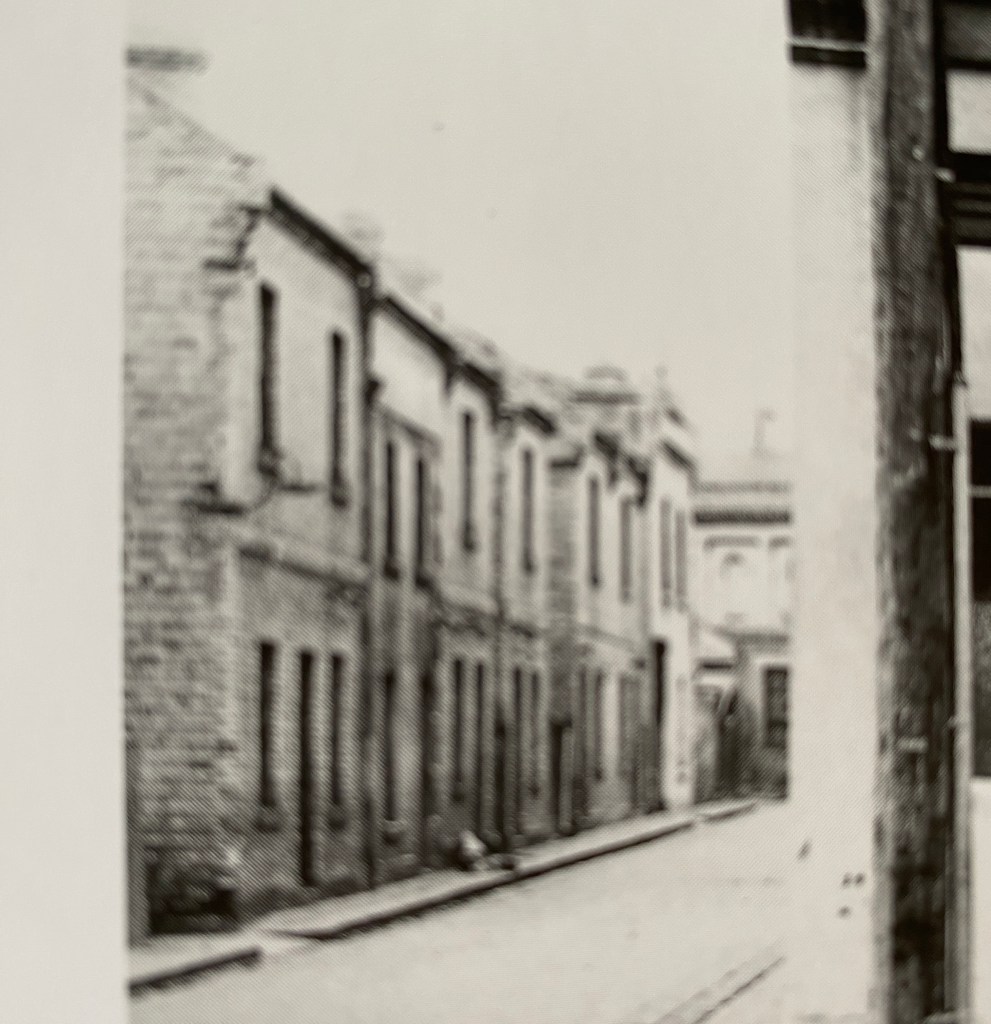 This part is the Little Lonsdale Street block, between Exhibition and Spring Street, which I’m assuming would have developed as it did. Regarded as a slum, the block between Little Lon and LaTrobe was subdivided with lanes off lanes, with tiny lots for two and three room houses, and some sheds, yards and workshops. Some houses were to the back or to one side of the lot, so that the privvy could be on the front, since there no back lanes. In Cumberland Place, there was one in timber and there’s a photo of it from 1901 and another one from 1950, just before it was cleared with all the others for the Commonwealth office block. There’s a number of photos from then, showing other little houses in the various lanes. The MMBW maps from 1895 and 1915 also show them pretty clearly. It was certainly more crowded than indicated in the original 1880 view (last image), I guess he didn’t want to show something that didn’t fit the impressive image of Melbourne he wanted to portray (or too much effort – they are tiny, and I couldn’t fit them all in ! All photos @library_vic.
