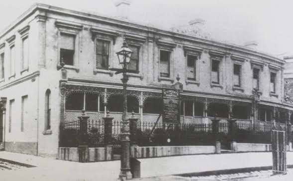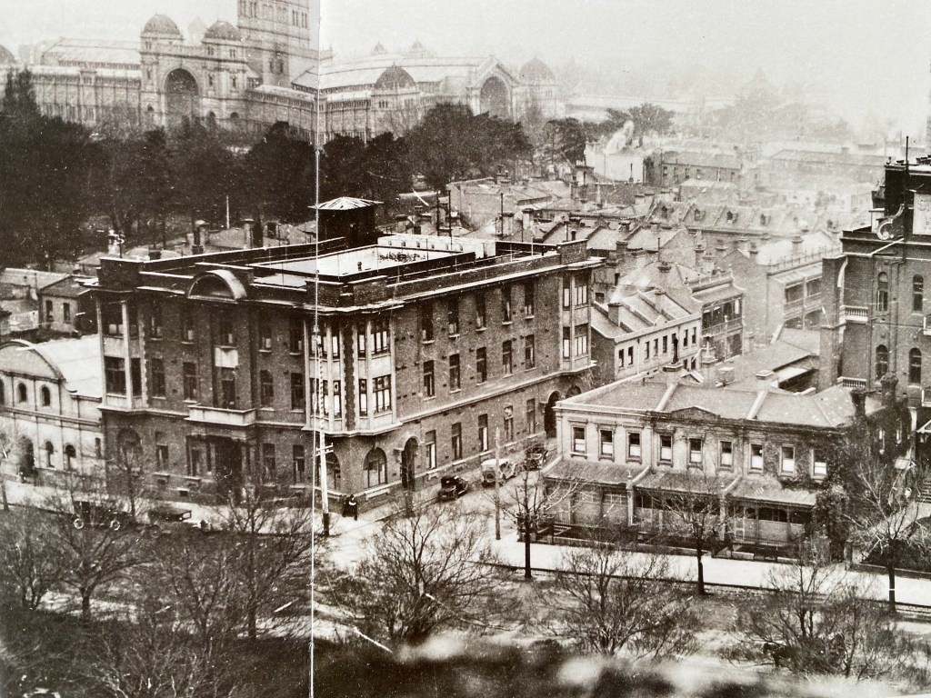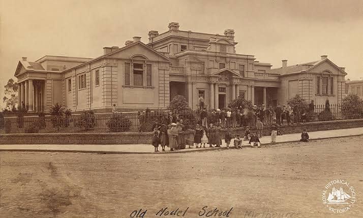 Latest part of my big drawing of Melbourne as it might have been, the triangular area east of Spring Street at Lonsdale. I’ve drawn the Model School, built in the 1850s and replaced by the College of Surgeons in the 1930s – the school was a terribly complicated building ! So I simplified. And school is out, I put in little figures leaving. And I had a smaller triangle which now has a sort of Chinese garden and the parliament station entry but didn’t have anything before, except Burke & Wills for a time, so I put the 8 hours monument on the corner. It was actually over in Gordon Square until 1903. There was still a bit of room, so I put the morgue there ! With a hearse out the back. The morgue was actually right on the corner of Swanston and Flinders until 1888, only old photo is at an angle, and when the Yarra was in flood, showing a rather elegant small c1860 building.