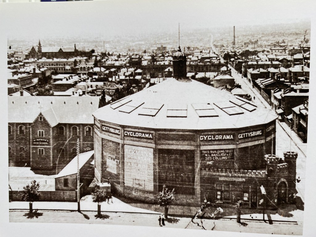 24 August: Latest instalment of my Melb as it might have been 1900 Birds Eye view – the bottom corner of Fitzroy, based on a few photos and the mmbw map from 1896. Ive been as accurate as I could. On the right, I’ve got a corner of the cyclorama (an entertainment consisting of a giant realistic painted scene wrapping around the viewer), St Patrick’s school next door (didn’t know that was there), the beginnings of St Vincent’s hospital in its terraces next to that. The curved parapet is the 1890 freethought hall, only the facade left now. A rather blurry detail of an 1889 coloured ad provides good clues too; seems there was large block of three storey terraces near the corner of Nicholson Street, which itself seems to have been empty from the 1880s at least, so I’ve drawn it empty.
