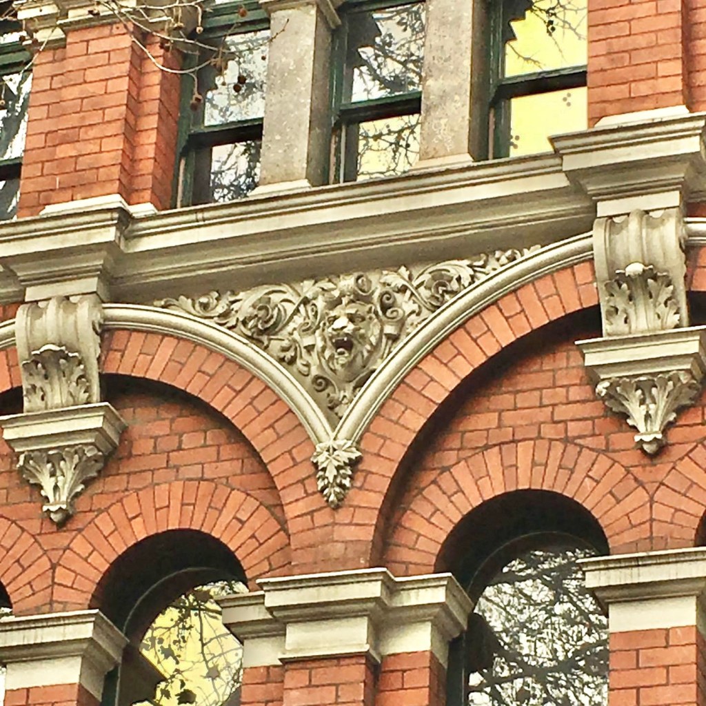 Usually hidden by the #damntrees, the wonderful inventive #redbrick #RomanesqueRevival / #QueenAnnestyle #shoptop pair was built in 1901, designed by #WilliamSalway. Love the #bracketedpiers forming the keystones of the #arches below, and the growling lions between.