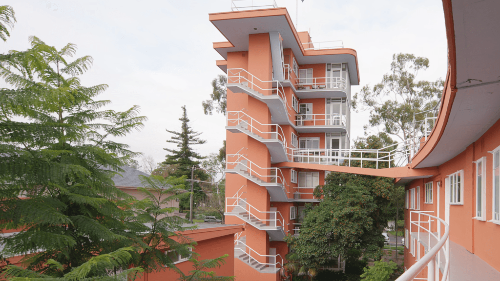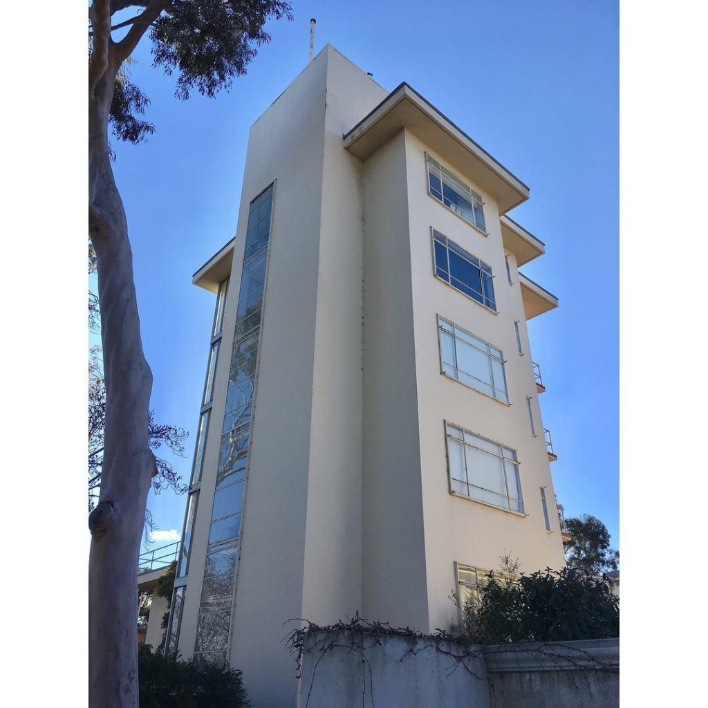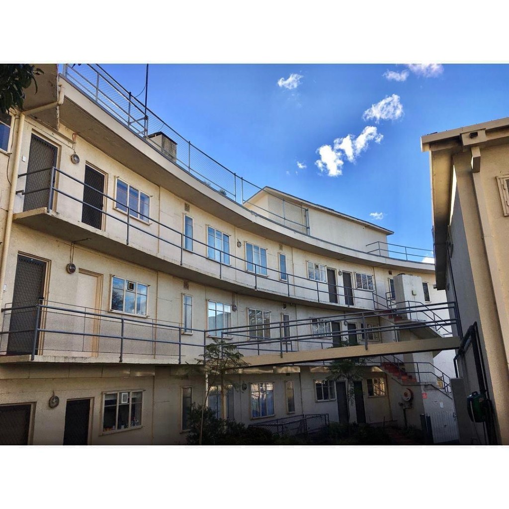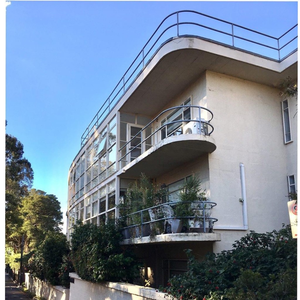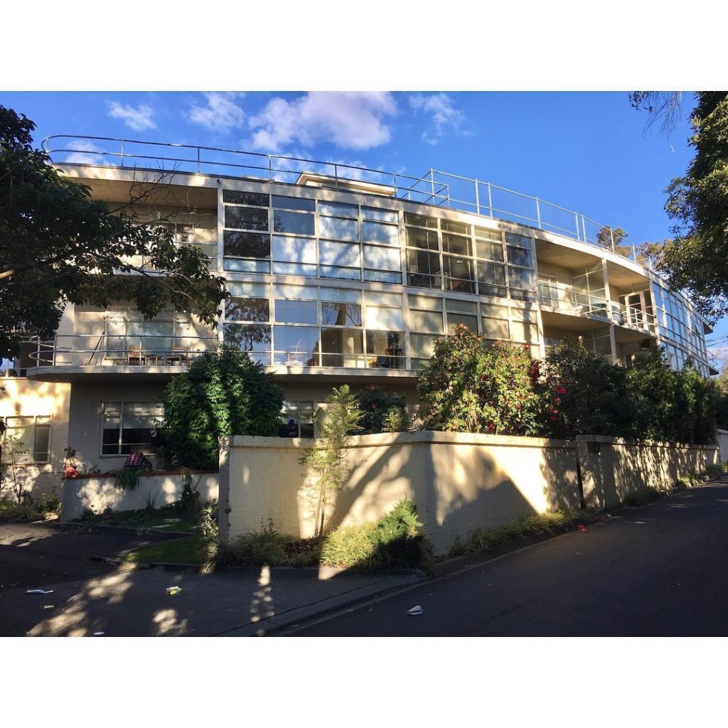 Repost 2018: The quite mad but fabulous #CaringalFlats, a bit of 1920s European #earlymodermism, but built 1948-51 – and in the middle of tony #Toorak, normally given to Tudor mansions. Built in Tahara Road by the James Family Agency, presumably as an investment, there’s 12 flats in a low curved block, and 6 one beds stacked on top of each other (with a tiny lift) in a tower ! The whole thing is entirely #reinforcedconcrete, and all very solar, with #sunrooms and a roof deck meant to be the playground. It was designed by #JohnRivett, who really went to town, pipe railings everywhere and flying walkways….wonderful, and for some reason this is the only notable thing he ever designed. Always thought if I had to live in Toorak, then I would choose here. In the tower of course. Update : it’s been painted a rather fetching shade of pink, apparently the original colour, last photo from nevertoosmall.com.
