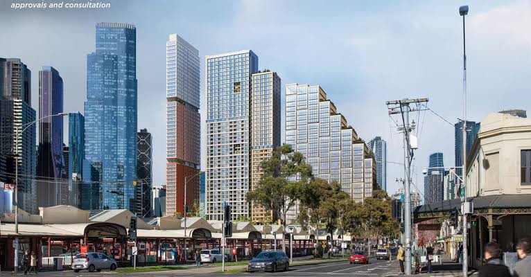 I saw this a week ago but immediately looked away – a wall of towers at the south edge of the Queen Victoria Market. The site is created by making the road there half as wide, and the tallest thin one is actually where the roundabout is, ie the middle of Queen Street, so the area will go from quite open to canyony. It’s offices, student housing, and affordable and build to rent apartments, on top of basement market parking. Something like this was part of the masterplan from 2015, but I really don’t know why exactly anyone thought it was a good idea. I’m sure Council is pleased about the mix of uses, but the scale is awful. Third image is an earlier scheme, much less like a wall.