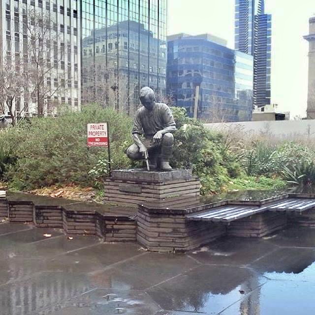 The #statue of #JohnBatman in the plaza of the National Mutual Building, as it was in 2015, then half hidden 2016, now gone who knows where. It was in the news today, with Ben Quilty saying it shouldn’t come back, because of his wonton murdering during the ‘black wars’ in Tasmania. The statue was by Stanley Hammond, and commissioned by the @cityofmelbourne in 1979, along with one of his rival #JohnPascoeFawkner, by Michael Mezaros. Funny, but they’re both looking down. There’s more fuss about these statues now that they’re gone than when they disappeared ! (I think they weren’t considered #goodart).