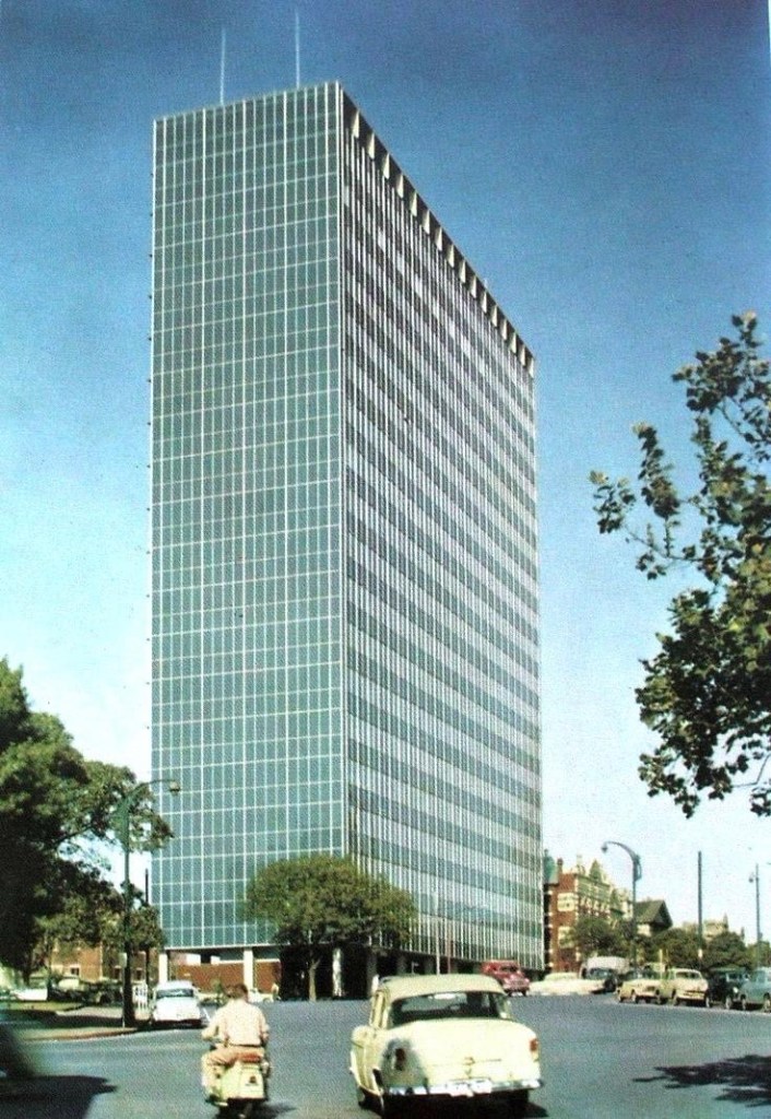 The #ICIbuilding does look splendid sitting at the top of #LondsdaleStreet; with parks on two sides it manages to look #freestanding in the #Corbusian ideal, even though it’s built almost on the south and west street boundaries. Designed by BatesSmartMcCutcheon, built 1956-58, Melbourne’s first skyscraper – well over the old 132ft height limit, and Australia’s tallest (for a few years), and first postwar skyscraper to be added to the Victorian Heritage Register in 1990.