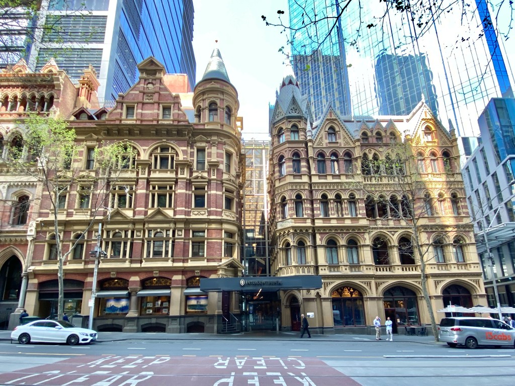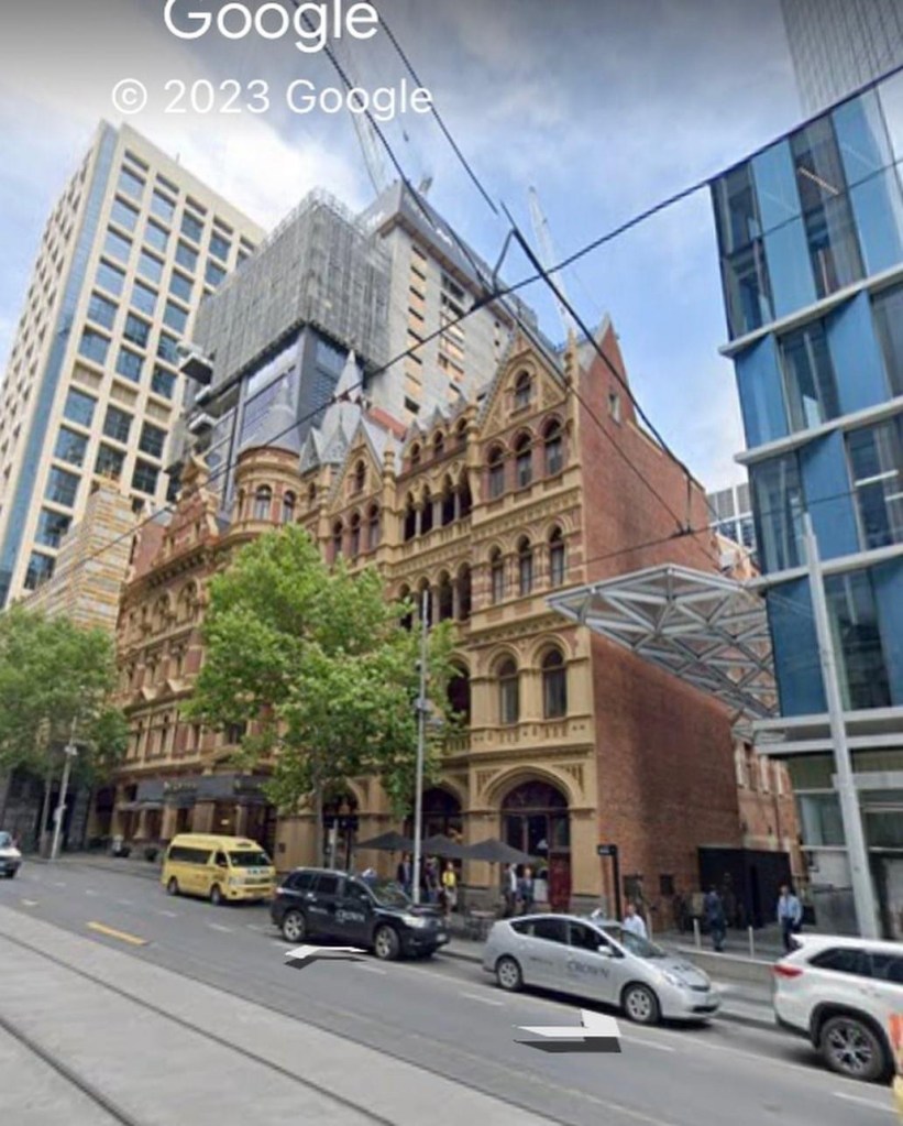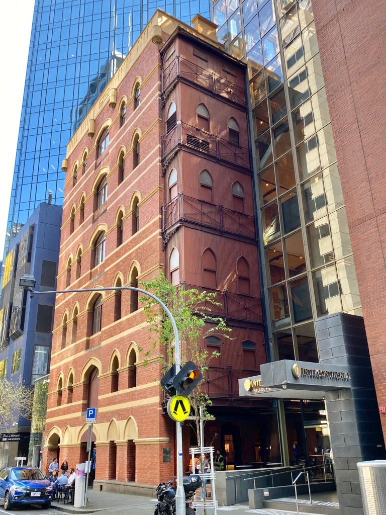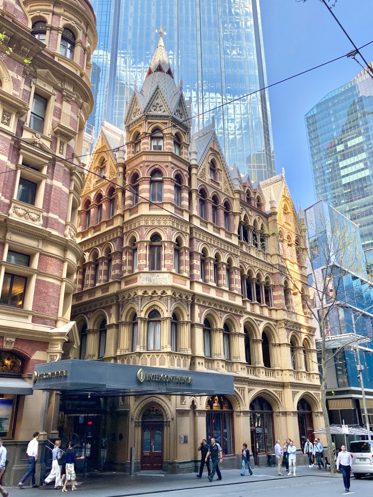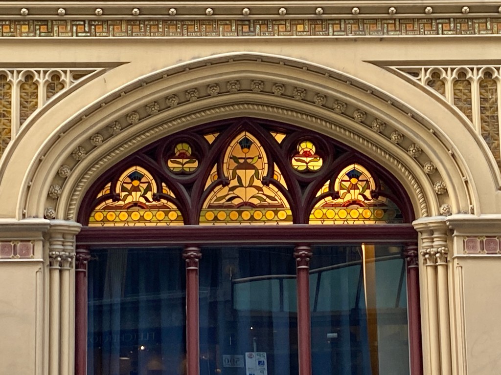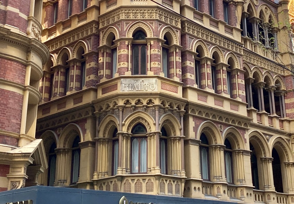 When you look at the Rialto close up it has so much amazing detail – a picturesque roof line of gables and a spire (entirely made of zinc), lots of little windows, brick stripes, a variety of gothic details in the cement render, lots of coloured and patterned tiles, and stained glass in the big ground floor window. The overall impression is a richness in effect, which of course the Victorians was the height of good taste, but later generations thought crass. So we’re lucky it’s still here in all its glory. Built 1891, architect William Pitt.