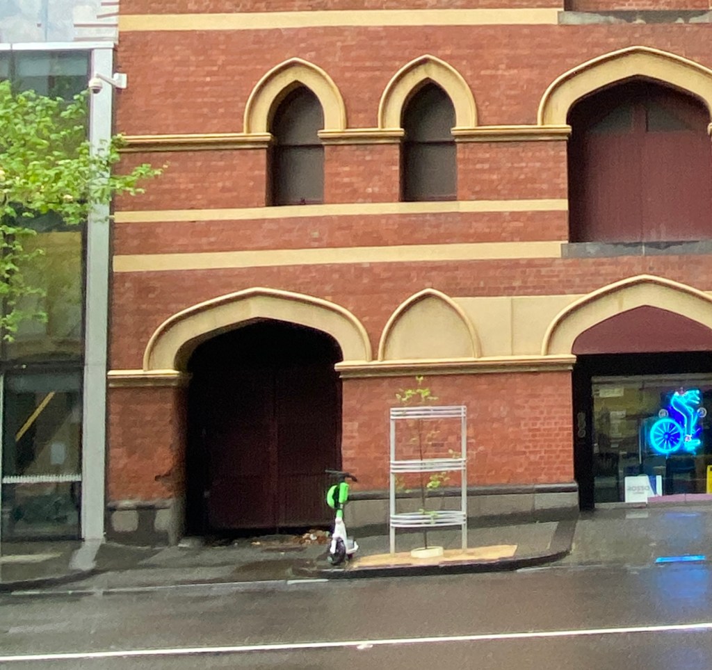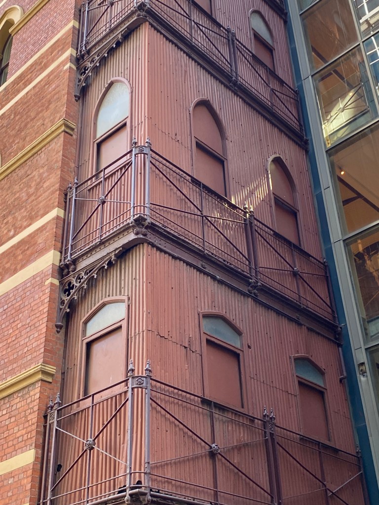The once famous ‘heritage toilets’ at the back of the Rialto in Collins Street. They’re actually just corrugated iron walls that enclosed urinals, possibly an afterthought added to the original 1891 design by William Pitt, since they’re not shirk on the original plans at the State Library – but he gave them Gothic pointed arches to match the rest. After much campaigning in the 1970s, the building was finally retained and restored and became part of a hotel in 1984 – but part owners the Grollo family were unhappy about retaining the toilets and left them with peeling paint for another two years. Now that history is largely forgotten- but the toilets are still there.