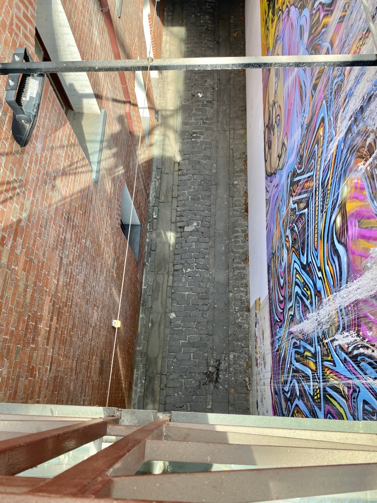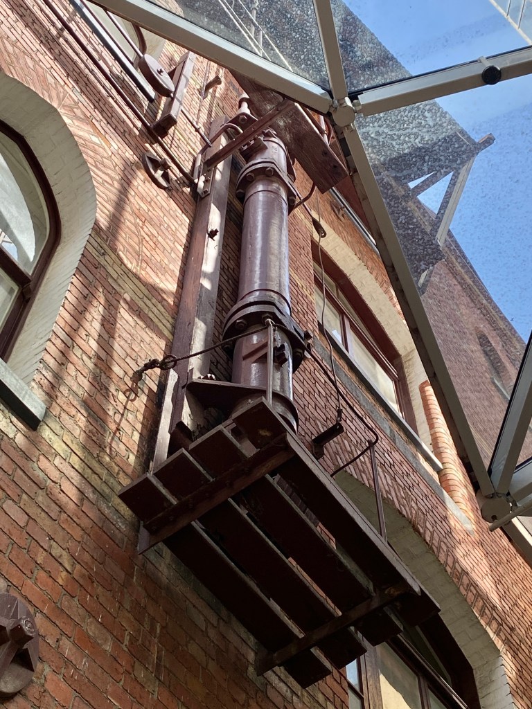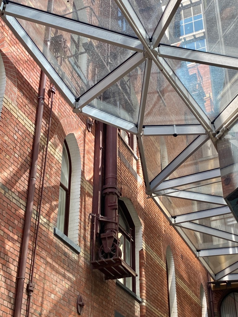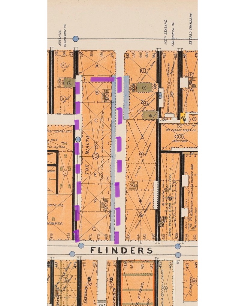 A hidden laneway, part of the original Rialto – it was actually built as much as a warehouse as an office building; I think the idea was the rooms off those long balconies could serve as showrooms, since this was the warehouse end of the city after all. So the design had a loop laneway built in, with an arched entrance off Flinders Lane, then down this narrow lane on one side, under the front end, and out to an existing laneway way the other side, separating the Rialto from the Winfield. The narrow lane side also had up-to-date steam winches to get the good up there. All this is rather obscured now; the main lane is under the atrium floor (to be revealed again in the current proposal), the narrow one down this odd gap. The winches are still there, but half above the new roof, and the openings long ago made into windows. Plan from the 1920s with my mark up; old photo of main lane Graeme Butler 1972, also the old winch shot.