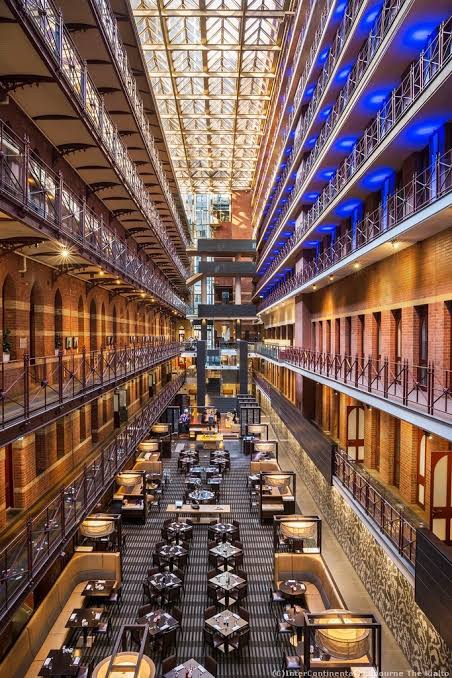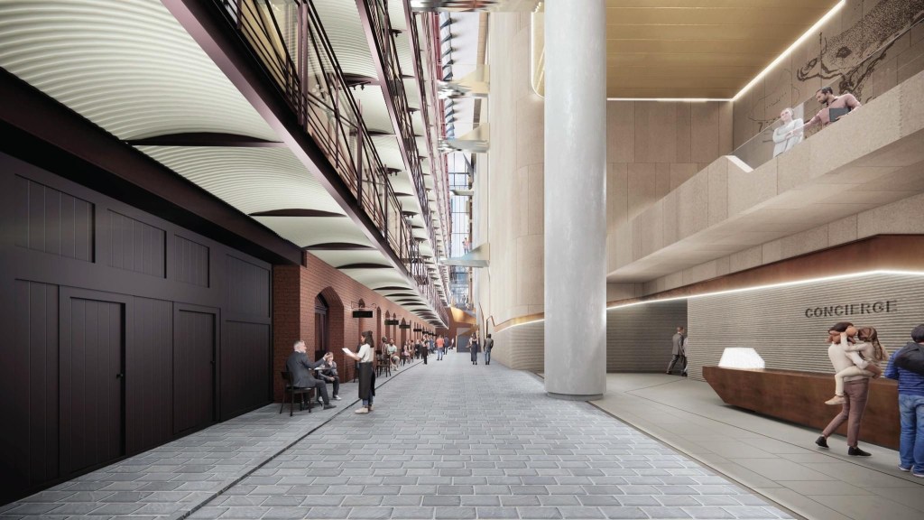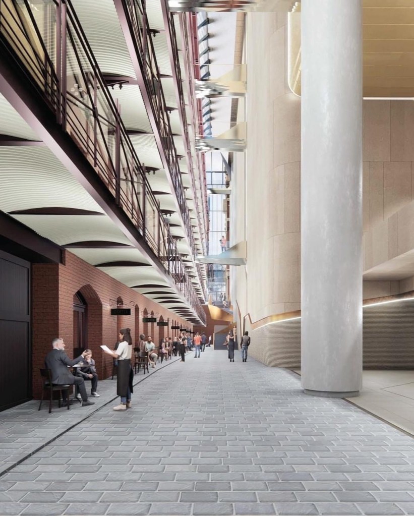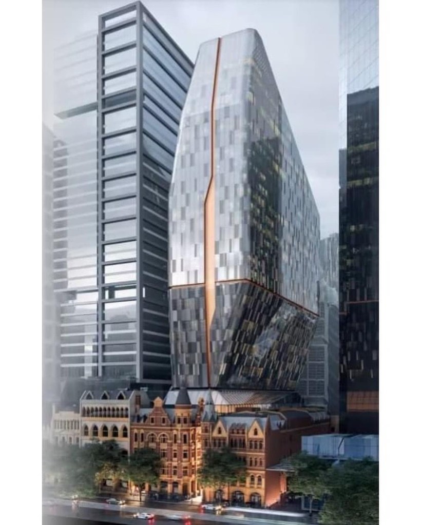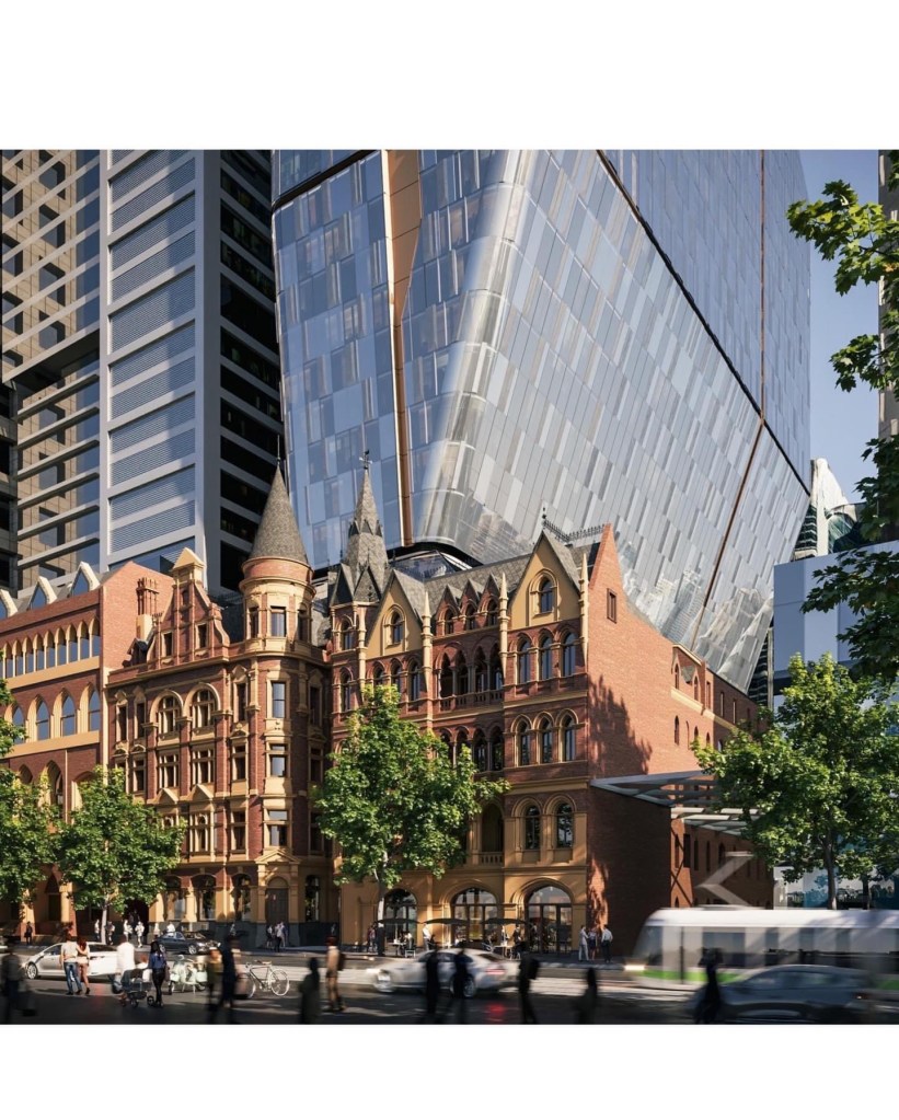 There’s a permit application for a tower popping out above the Rialto ! It would replace the 1984 hotel wing of the Winfield building with a big hotel / office tower that bulges right out over the Rialto building. The images make it look more dominating than it probably really would be from the street, but those cute towers would definitely not have sky behind them any more. The fifth image is the atrium now – the left side is the original Rialto with its open balconies, the other side is the matchy 1984 wing. The original laneway between the buildings was narrower than the current atrium, so they’re building back to that line. I don’t mind the basic idea, but I don’t think the tower should cantilever right over the Rialto. The plans are currently advertised on the Heritage Victoria website so you can lodge an objection.
