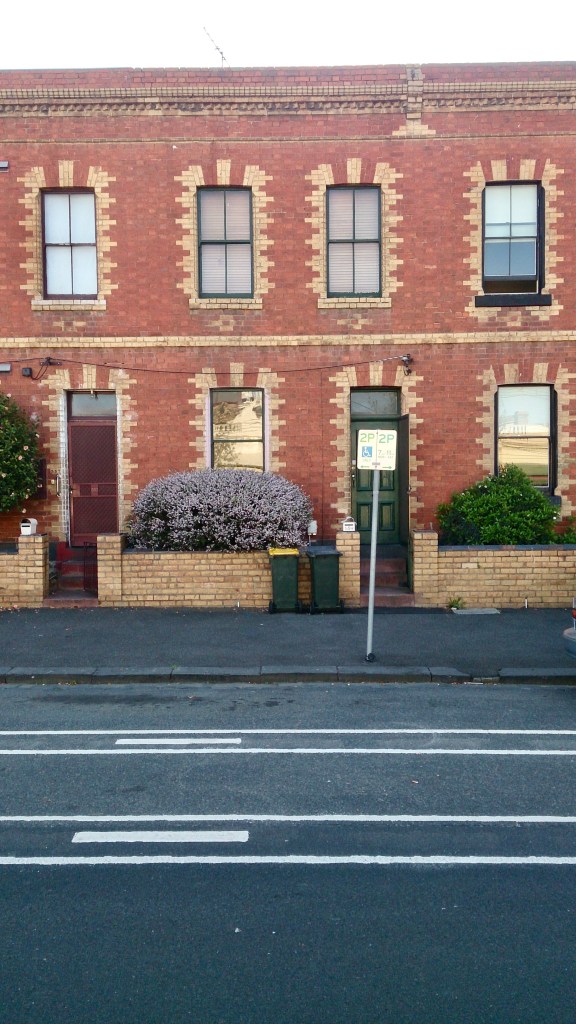 Cambridge Terrace, Drummond Street Carlton, just north of Princes Street; named after the home town of the bricklayer owner/developer, which also explains the dominating #brickyness. A row of six, apparently the first part (which part I don’t know) built 1867, pretty early for face #brickwork and #polychromebrick for that matter. The earlyish date may also explain the lack of #verandah, though I’m going for the desire to show off the bricks. The rest built matchingly in 1885. I do like the way the upper floor windows don’t align with the lower floor, the bold patterns making it not so noticeable.