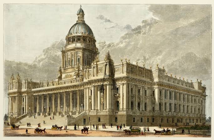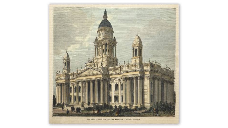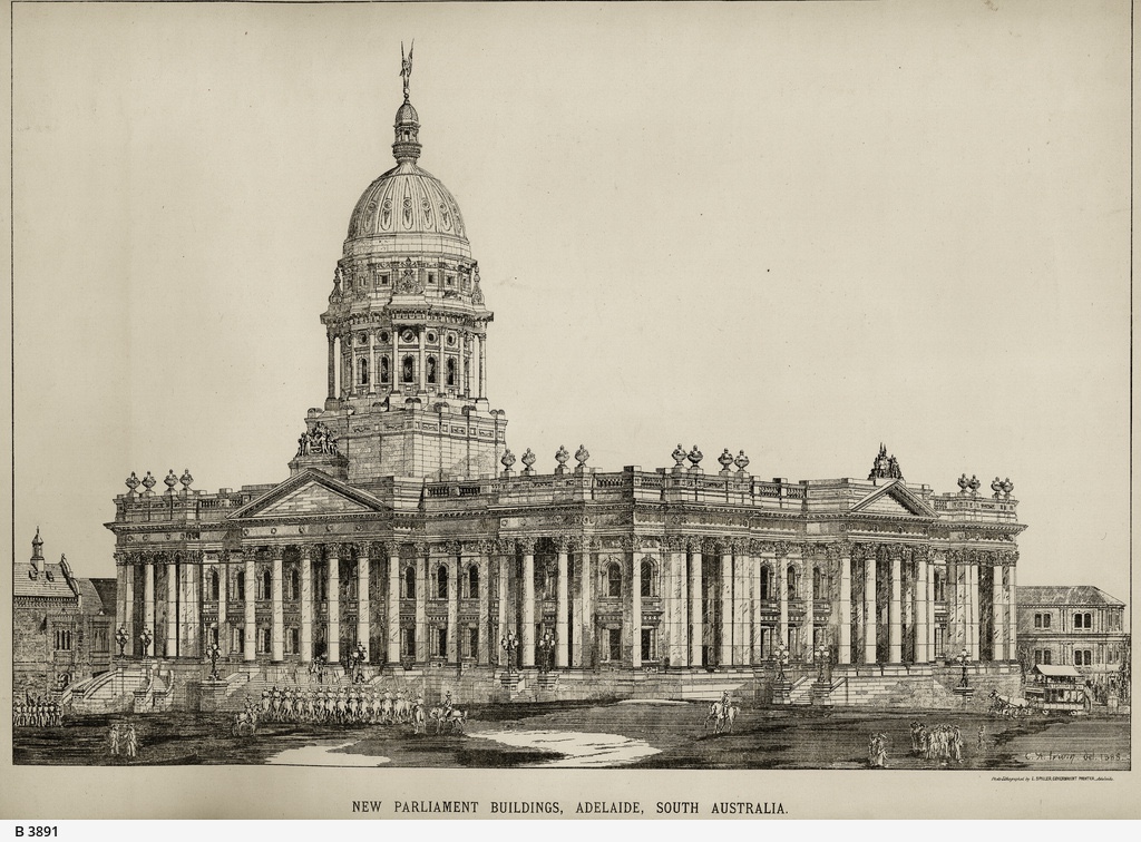 The never built dome of Parliament House ….Adelaide! Just discovered the grand 1881 design for the South Australian parliament by EJ Woods had a dome that was pretty much the same as our 1877 design by Peter Kerr (2nd image). Seems like they copied us but it’s more complicated – the Adelaide design was a reworking of a more elaborate design of 1874 by Edmond Wright and Lloyd Tayler, which has a similar but taller dome (3rd image), so maybe Kerr took the idea when he was reworking his original very even more elaborate 1855 design and made it fit, then Wood copied this new version. Neither place ever got their dome, and Adelaide’s was even more incomplete than ours for ages, with only about 1/3 built by 1889, right up until the 1930s, when it was completed to a simpler design. All pics except Melbourne @statelibrarysa.
