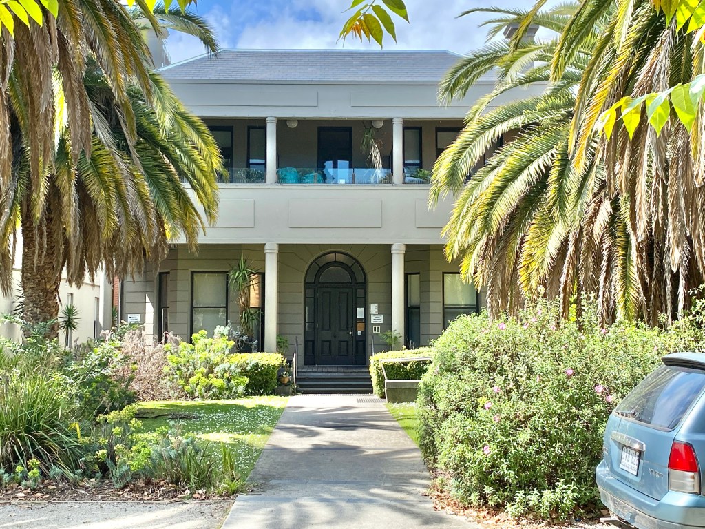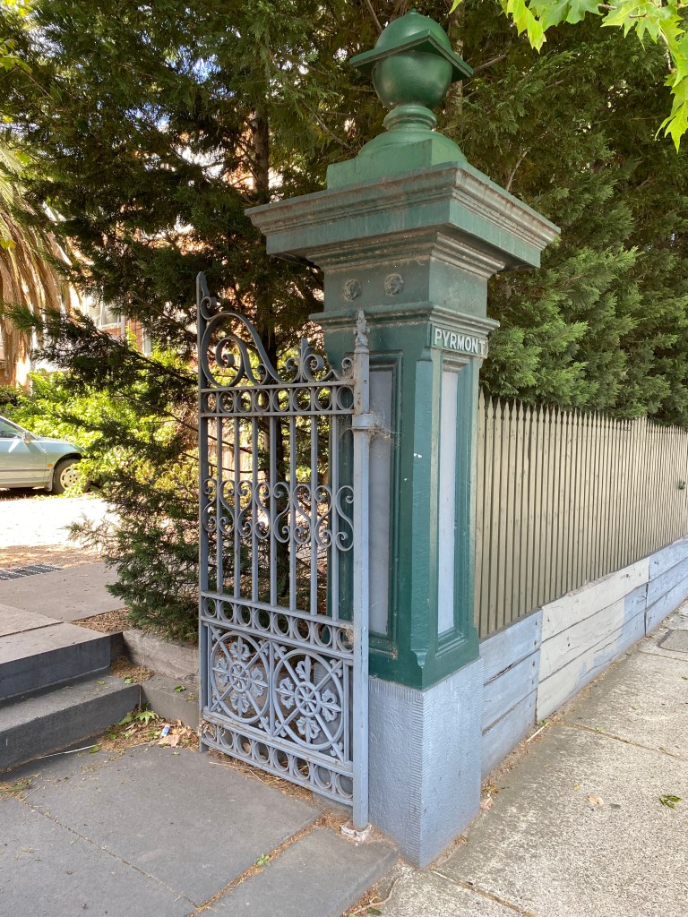 Another surviving St Kilda mansion, in Barkly Street near the top of the hill, but the gates are better than the house. The house was built in 1868 for successful tanner and leather merchant Michaelis Helenstein, a pillar of the St Kilda Jewish community. The gates are a bit later, dating from 1877. The house became a boarding house by the 1920s, eventually becoming a rooming house run by Housing First, recently turned into self contained flats. The verandah of the house looks 1920s or 30s, definitely not Victorian; it was probably a timber one, cast iron being popular a bit later.