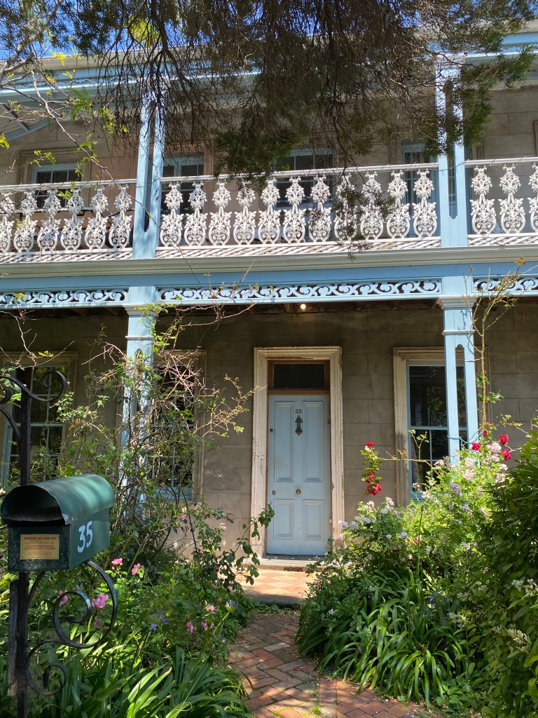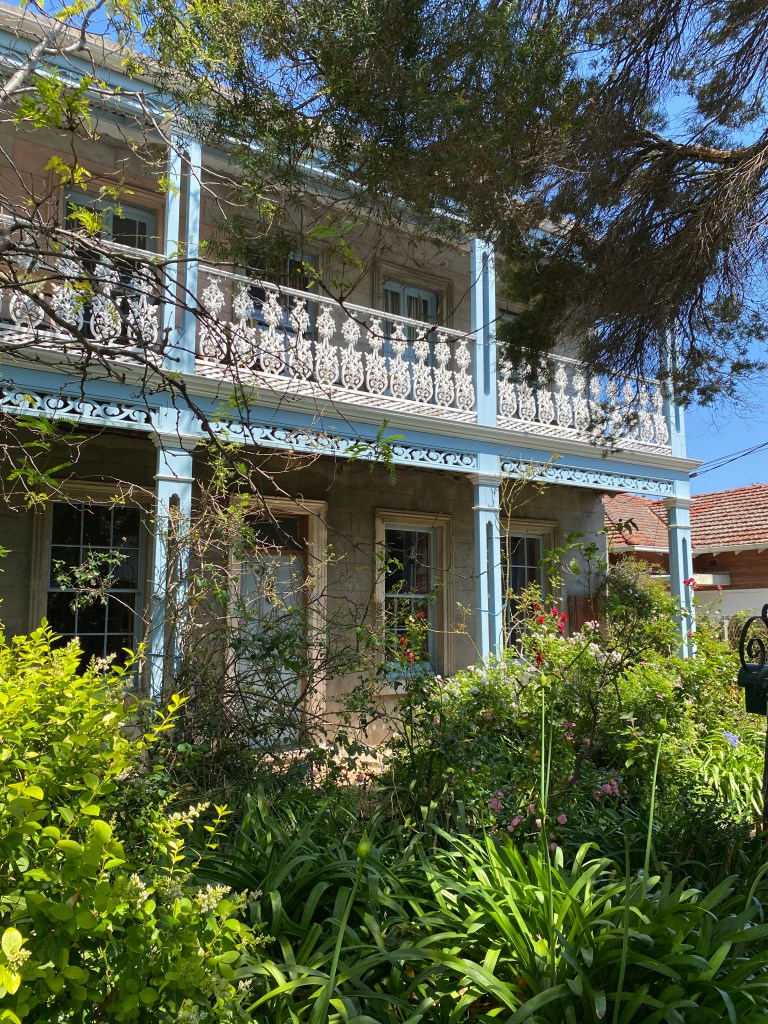 Delightful house in Gurner Street St Kilda, looking like a country cottage, with big trees in front, a messy flowery garden, and charming peeling paint. Not separately listed in the st kilda heritage study so all I can say is it was built before 1873, when it appears in the Vardy map, attached to a larger house to the left. The wide timber piers of the verandah and the restrained cast iron look 1860s-70s to me. No old real estate listings, so some family has enjoyed it for many years.