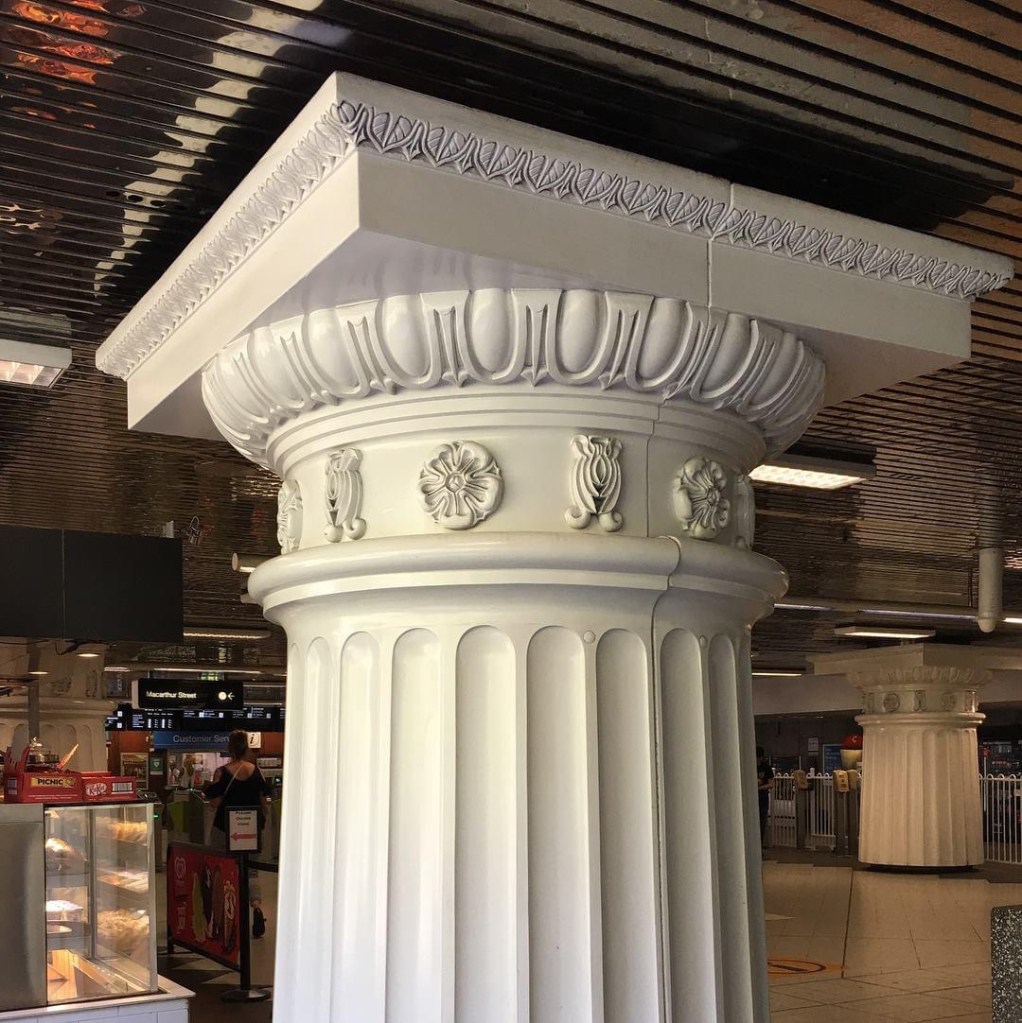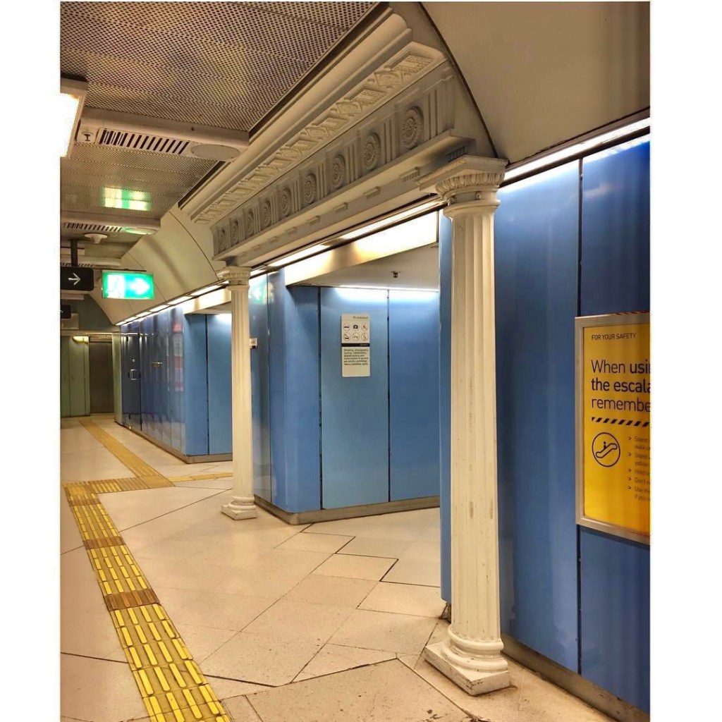 Parliament Station, completed January 1983, designed by McIntyre Partnership (firm founded by #PeterMcIntyre), the second to open of the 10 year long #cityloop project. Love the bizarre but fun #column tops, full scale replicas of the #TuscanOrder columns of the front 1889 collonnade of the nearby Parliament House. The miniature classical surrounds at the platform entries are rather less successful, whereas the simple stainless steel arch over the Bourke Street stair is a good bit of historic reference while not being literal. Its really a #latemodern interior, with great mirror finish ceilings, lots of white and blue enamelled metal walls and ceilings, slim tubular lights, stainless steel framed signs, and of course those loooong escalators gliding down under an arched roof. All pretty intact, but very worn in places, and cluttered up with equipment, newer signs, vending machines etc. but really it’s held up well given it’s now just over 40 years old ! I hope it’ll be restored one day, not completely done over. I mean, it won an Architects Institute Merit Award in 1985. 2023 : havnt been down for ages, others tell me it’s still just as worn.
