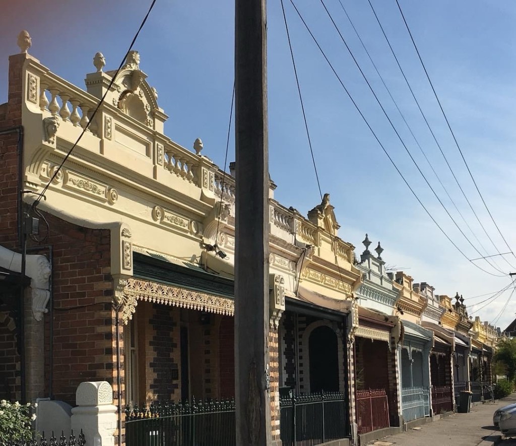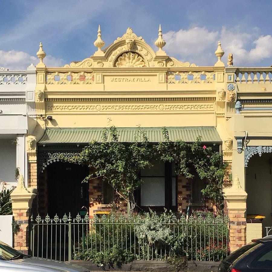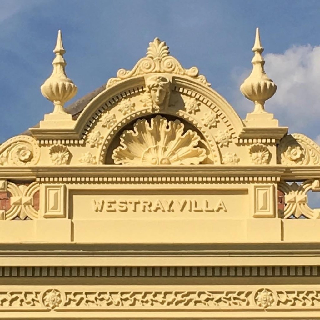 Westray Villa, Canning Street, #NorthCarlton, 1881. A fully intact parapet for my #melbterraceparapet collection. This is elaborate but pretty typical, with a central #clamshell, #ladyface #keystone, but it’s got its urns, complete with spikes. It’s the only fully intact one in a row of 10, so maybe it’s the only one that’s been restored – though the first 4 are a bit different to other 6, which this one seems to one of, but it has more detailing, maybe it’s been over restored ? It faces Davis Street, which is just about all little cottages like this one, with very few intact parapets.