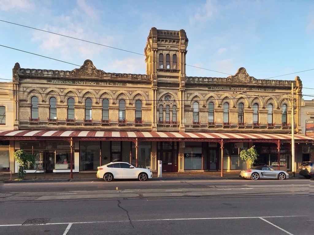 Harcourt & Parry Drapery, 1888, by #CrouchandWilson, sits very grandly in Park Street #SouthMelbourne, near the Town Hall; and unusually the facade is made of carved stone, and there’s a little tower, and you can see ‘H&P’ in lovely curly script up there. It was I guess a mini department store for cloth. Always thought it was Patross Knitting Mills, but that started here in the early 30s. The cloth-based uses still continue, with the #VictorianTapestryWorkshop setting up here in 1976 soon after the State Government bought that whole block of South Melbourne from the Anglican charity that had owned it since 1855. Lovely example of Gothic Revival, or maybe Medieval Italian – the round arched window with a pointed arch above was a particularly popular motif in Victorian Melbourne. Update : it’s now the Australian Tapestry Workshop.