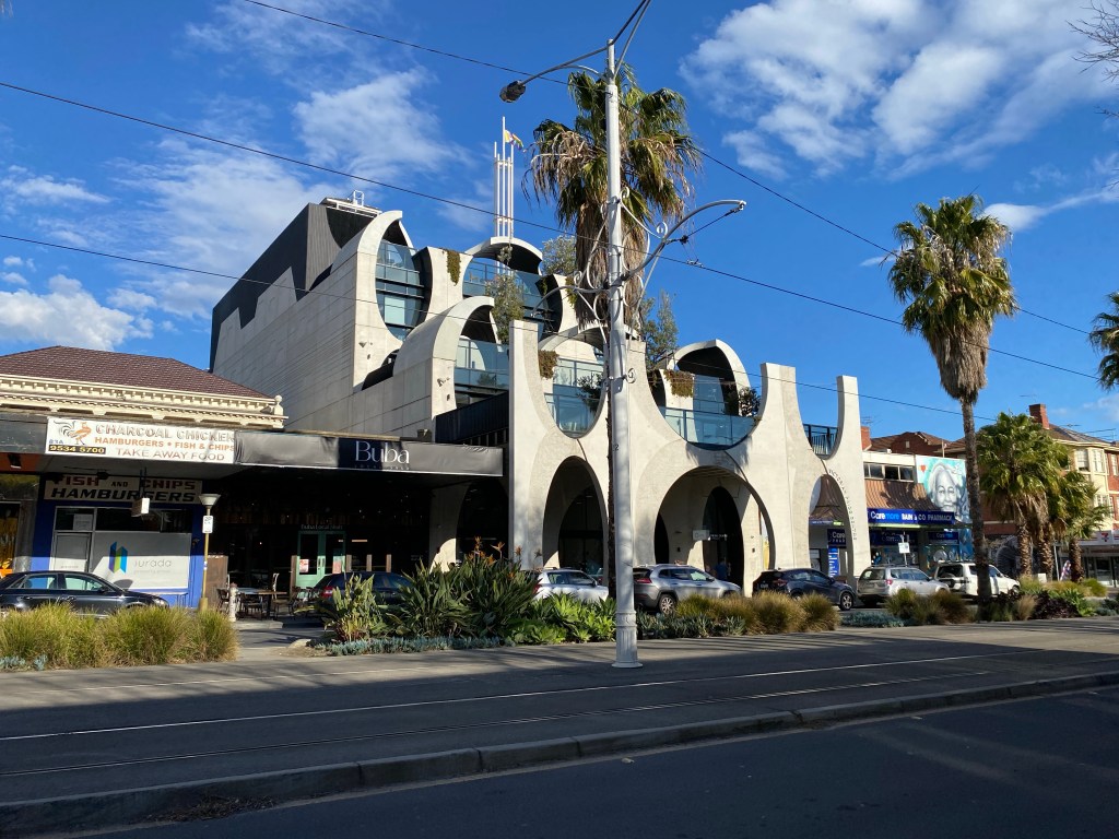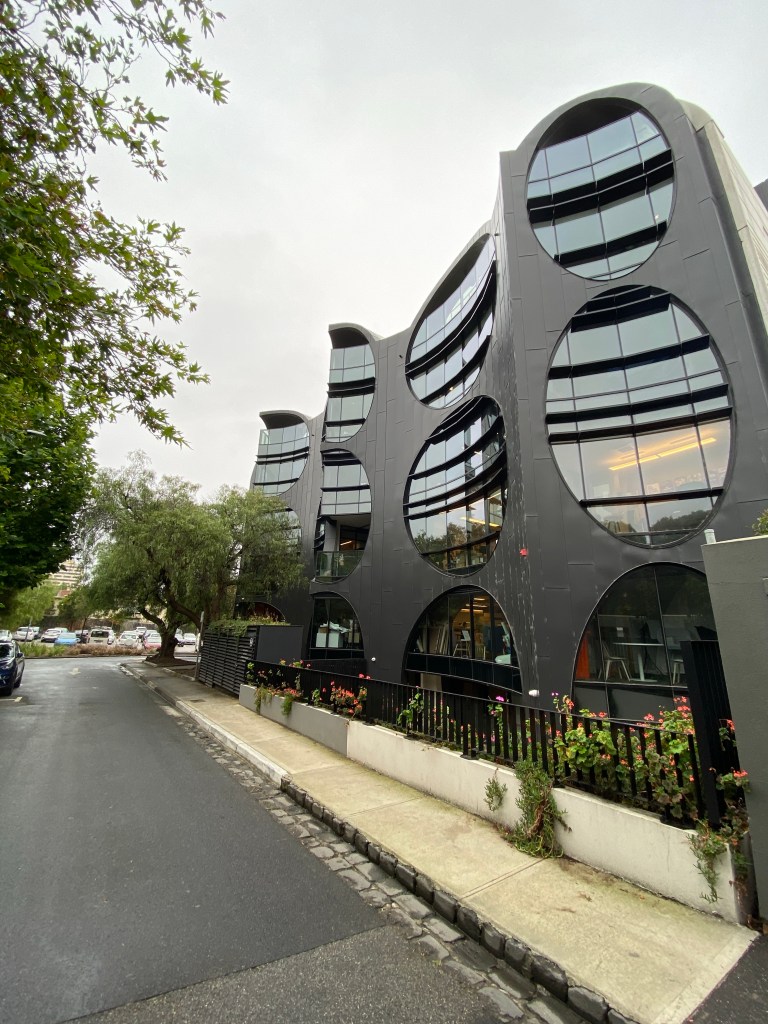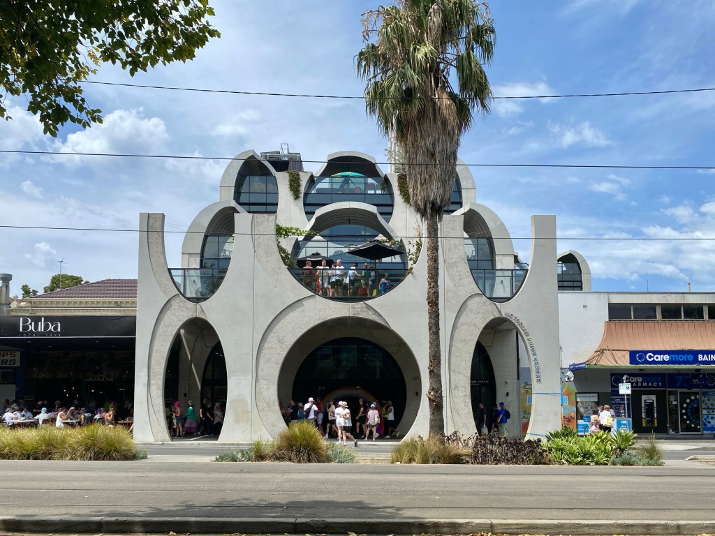 Pride March over, time for architecture! The wild curvy Pride Centre in Fitzroy Street, first pic just after the parade, others a week ago – as I said in 2021, the design, by @grantamonarchitects and @bauarchitects.urbanists, doesn’t attempt to represent LGBTQI in some obvious way (thank goodness) but instead was inspired by the exotic styles (and many domes and arches) of st kilda, re-interpreted as circular and ovoid tubes, that notionally go right through the building, but really only seen in the facades and the ground floor. (There is a giant flagpole on top flying the rainbow colours though). I was worried about the massive scale, and it is big in the street, but with the stepping back, it’s not so dominating; I’m not a fan of steppy buildings but this one overlaps and blurs the edges, making for a variety of effects. Straight on is actually rather nice, and exactly like the render. I’m still concerned about the way it builds right out over the footpath, with a tall wall right on the street, but it certainly fits the design, and I guess the street is wide enough to cope (though I don’t want to see this leading to a whole line of them). There will be great views from the all the decks, and a rooftop bar (yay!) but one day someone will build something equally big where the ex-bank is on the corner, getting somewhat in the way. Update : I thought today it would be bursting with people but they must have safety limits or only ticketed events, not so many on it, and a queue to get in. And the rooftop is generally only open for events. Mind you, it is great to have !