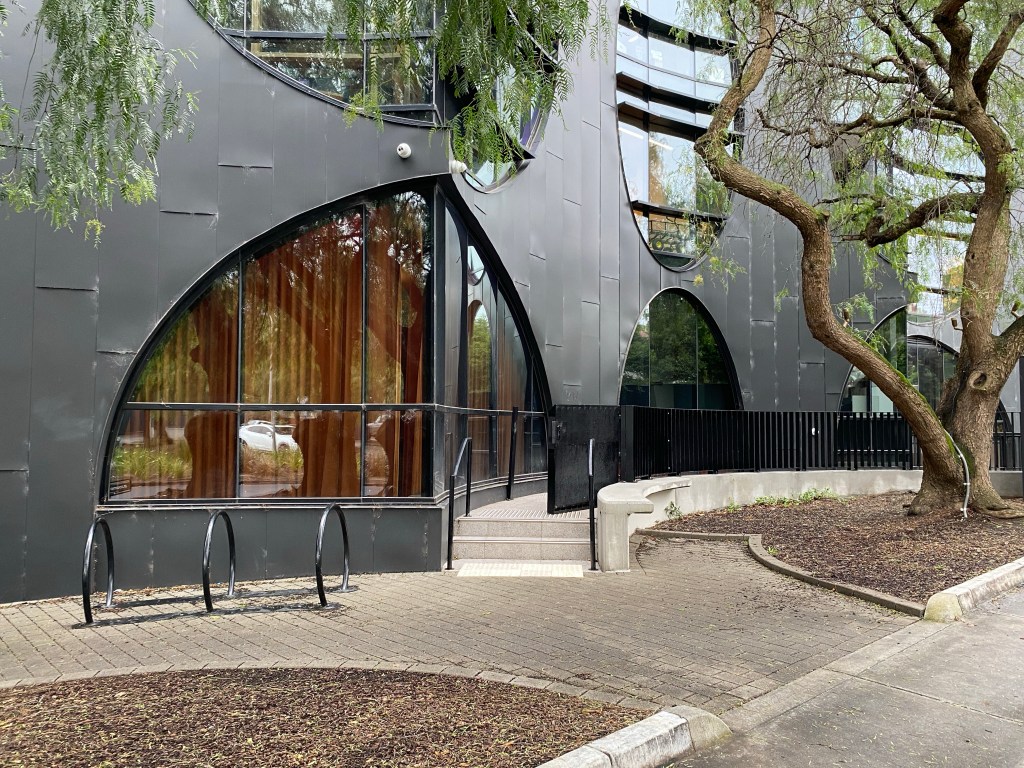 Hobbit house at the back of the Victorian Pride Centre in St Kilda. I do like how it has rounded openings in surfaces that are sort of scooped out, ending up with pointy corners. A bit dour in that dark grey cladding (with a zillion spider webs), but the chairs and geraniums add colour. Architects @grantamonarchitects and @bau_brearley.arch.urbanists.