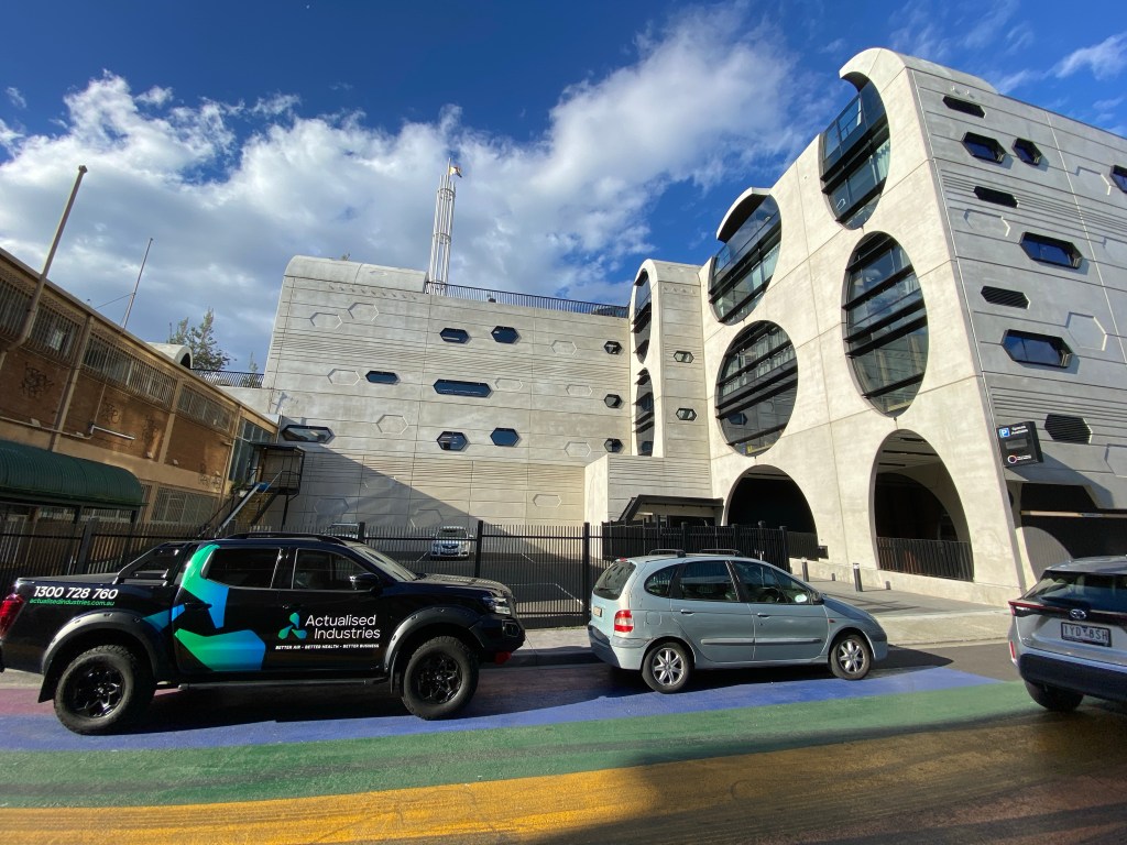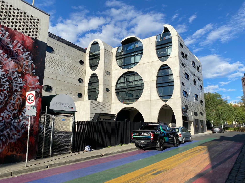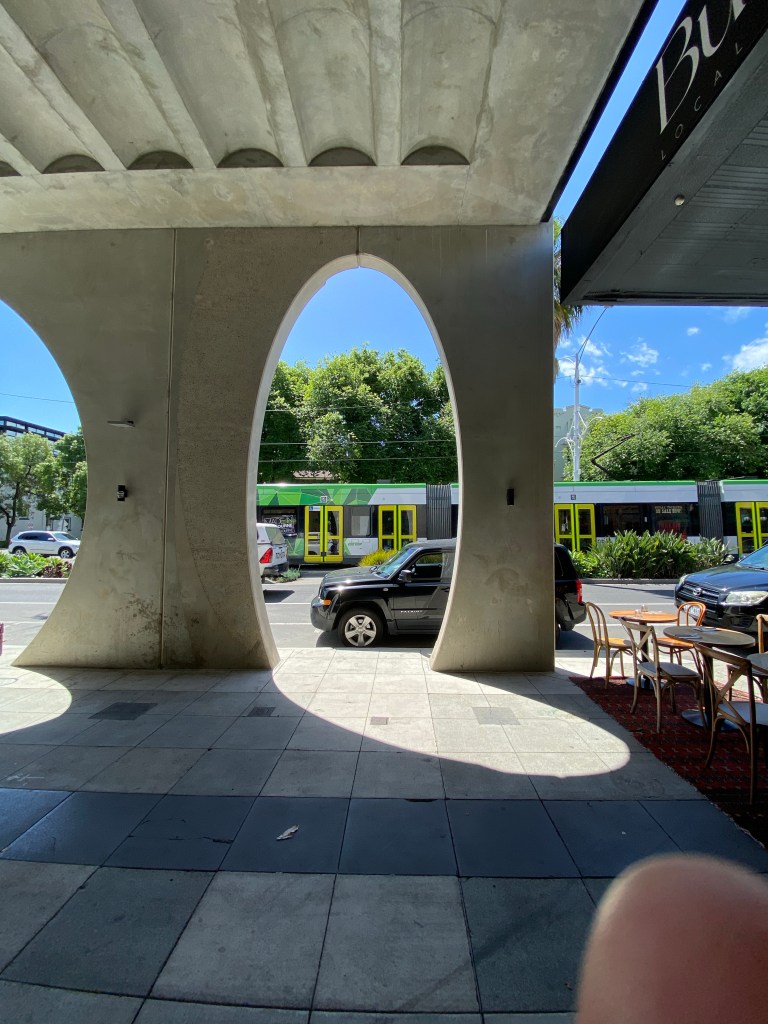 The Victorian Pride Centre porch / verandah makes some great shadows. I hadn’t noticed till I took a photo, wanting to say that it’s actually a very generous space under there. But the amount of structure, really a two storey wall with big holes, taking the building right up to the gutter, rather breaks up the street wall.