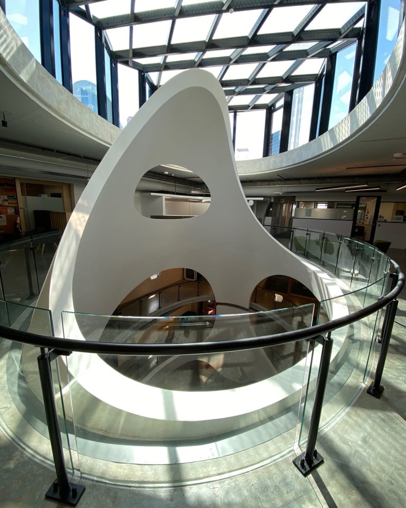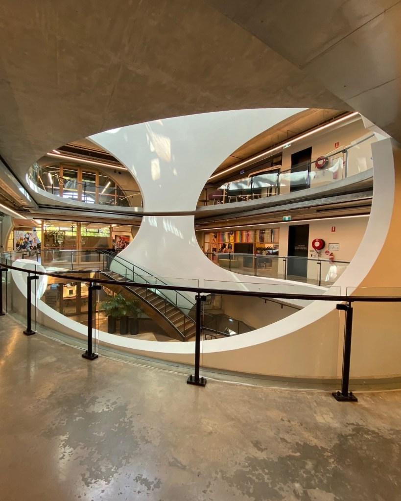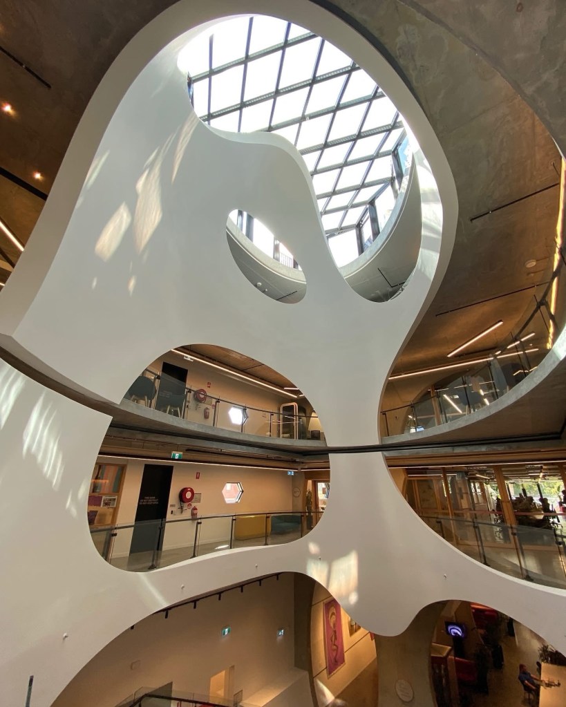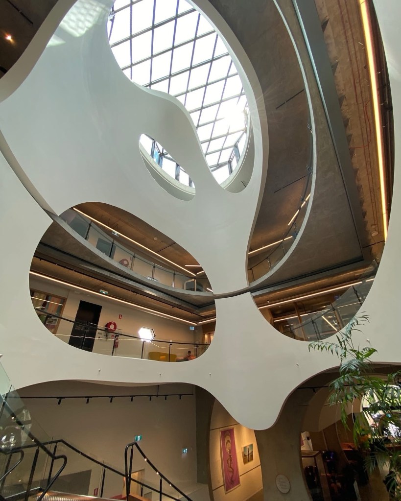 Been hanging out at the Pride Centre in Fitzroy Street St Kilda for a while, and just took the lift to the top floor for the first time to check out the atrium – pretty wild ! Very fluid. It’s a rounded cone, I think, with rounded bits cut out. Amazing really. I like it. Photos go top down, except for the first one. The ground level is very spacious, with lounges and booths so you can just play on your phone if you like. It’s composed around the idea of circular and elliptical tubes, with only the cross walls in concrete. Designed by @grantamonarchitects and @bau_brearly, it opened in mid 2021, and houses all sorts of queer organisations like @joyfm and @thorneharbour.