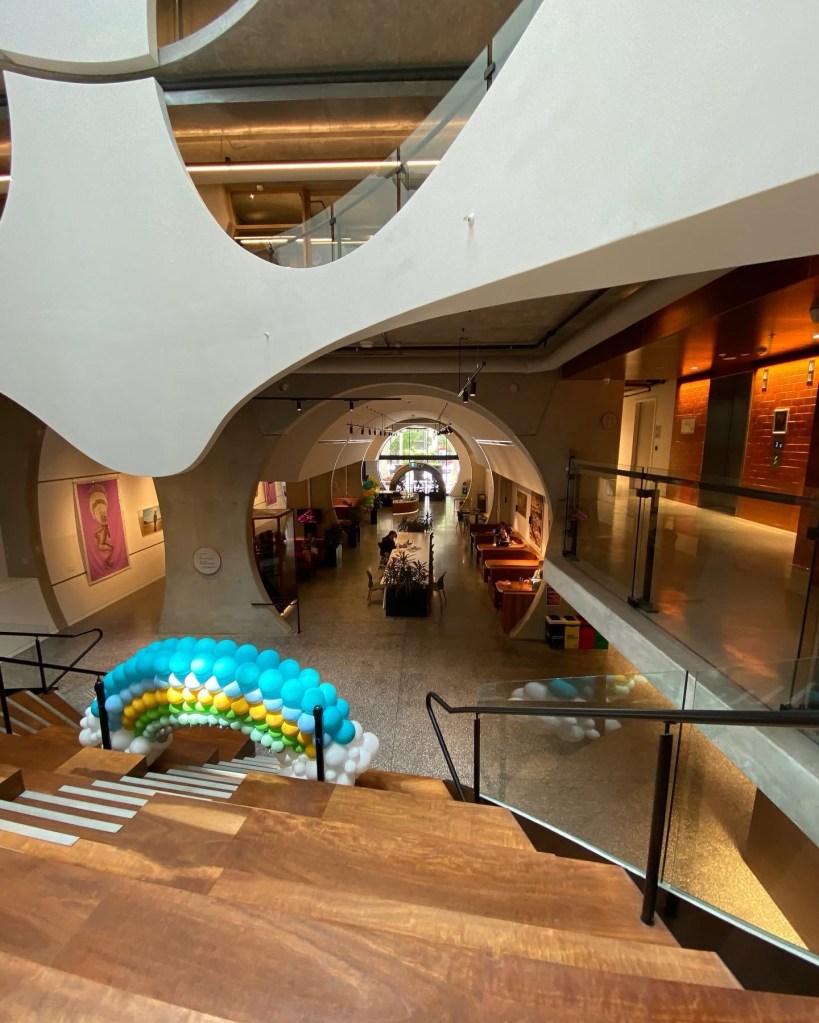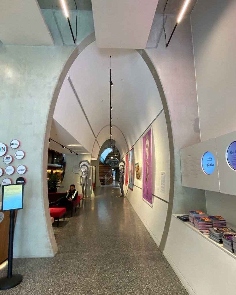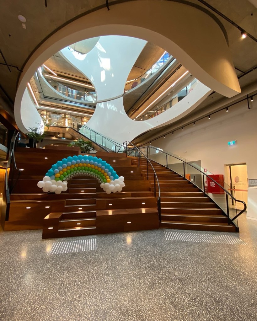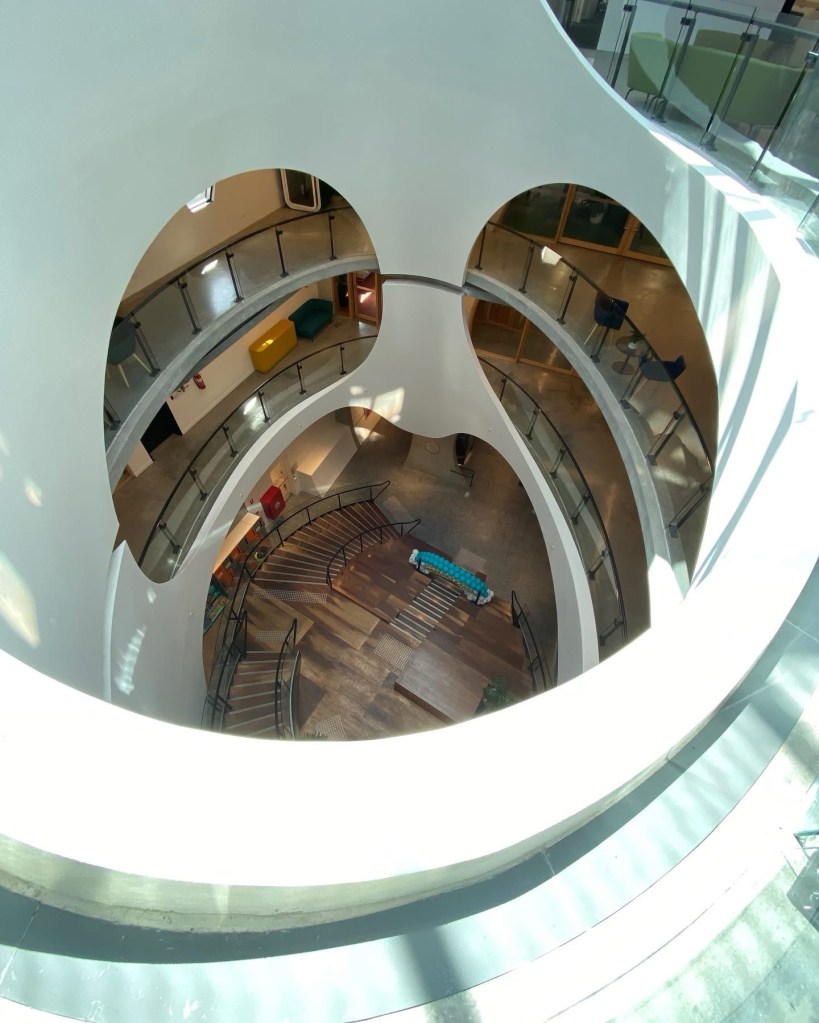 Been hanging out at the Pride Centre in Fitzroy Street St Kilda for a while, and just took the lift to the top floor for the first time to check out the atrium – pretty wild ! Very fluid. It’s a rounded cone, I think, with rounded bits cut out. Amazing really. I like it. Photos go top down, except for the first one. The ground level is very spacious, with lounges and booths so you can just play on your phone if you like. It’s composed around the idea of circular and elliptical tubes, with only the cross walls in concrete. Designed by @grantamonarchitects and @bau_brearly, it opened in mid 2021, and houses all sorts of queer organisations like @joyfm and @thorneharbour.