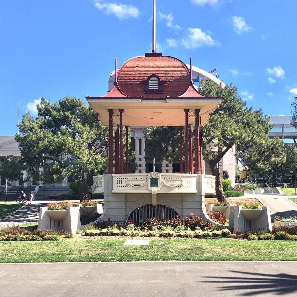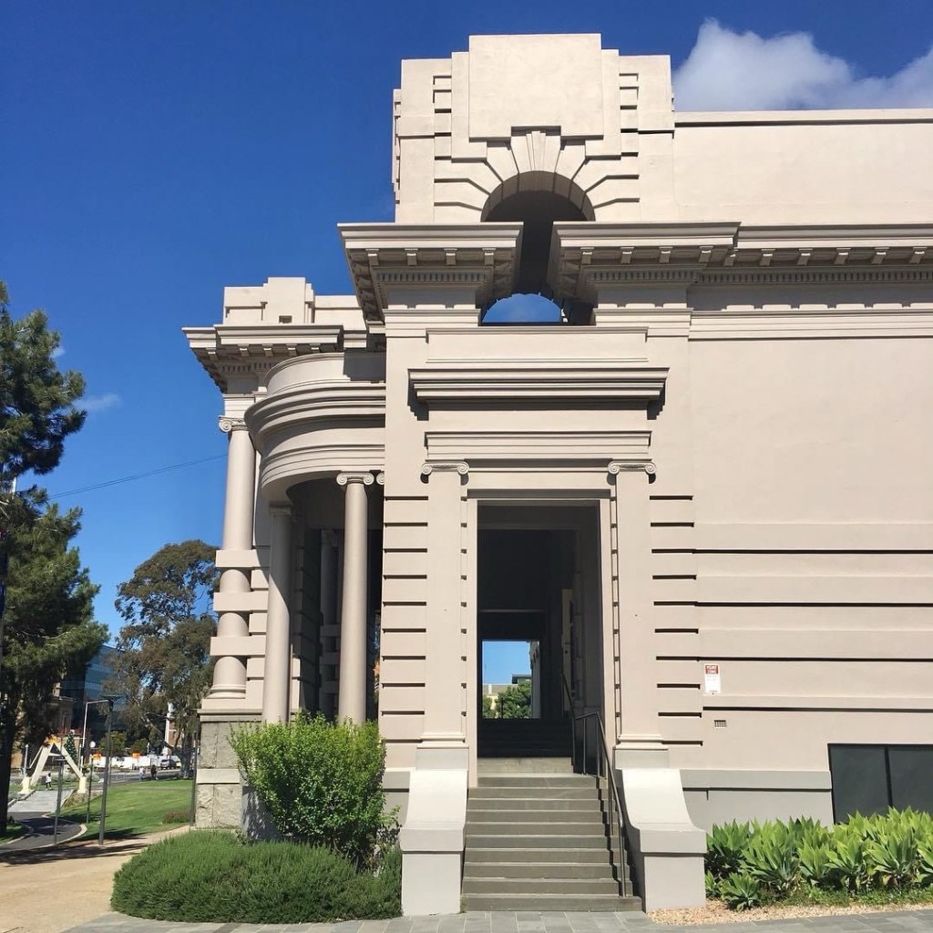 Laird and Buchan, with a young #PercyEverett, won a competition for the park in 1916, and also designed the particularly delightful almost Art Nouveau #bandstand built in 1919. Then they also designed on axis the elaborate Edwardian Baroque #WarMemorial, which rather nicely is called the #PeaceMemorial, built just after in 1922. It takes the form of a large foyer – because it was meant to lead to a never built memorial hall. It sat on its own for a while, with gap between it and the Town Hall filled in at some point. I’ve never been in, since it’s only open by appointment and probably ANZAC day (interior photo Monument Australia). Interesting to see the new #ARMarchitecture library dome isn’t quite on that axis. With the trees either side, the memorial foyer doesn’t have the presence it originally had. The park is pretty too, though strangely sunken, since it used to be a gully.